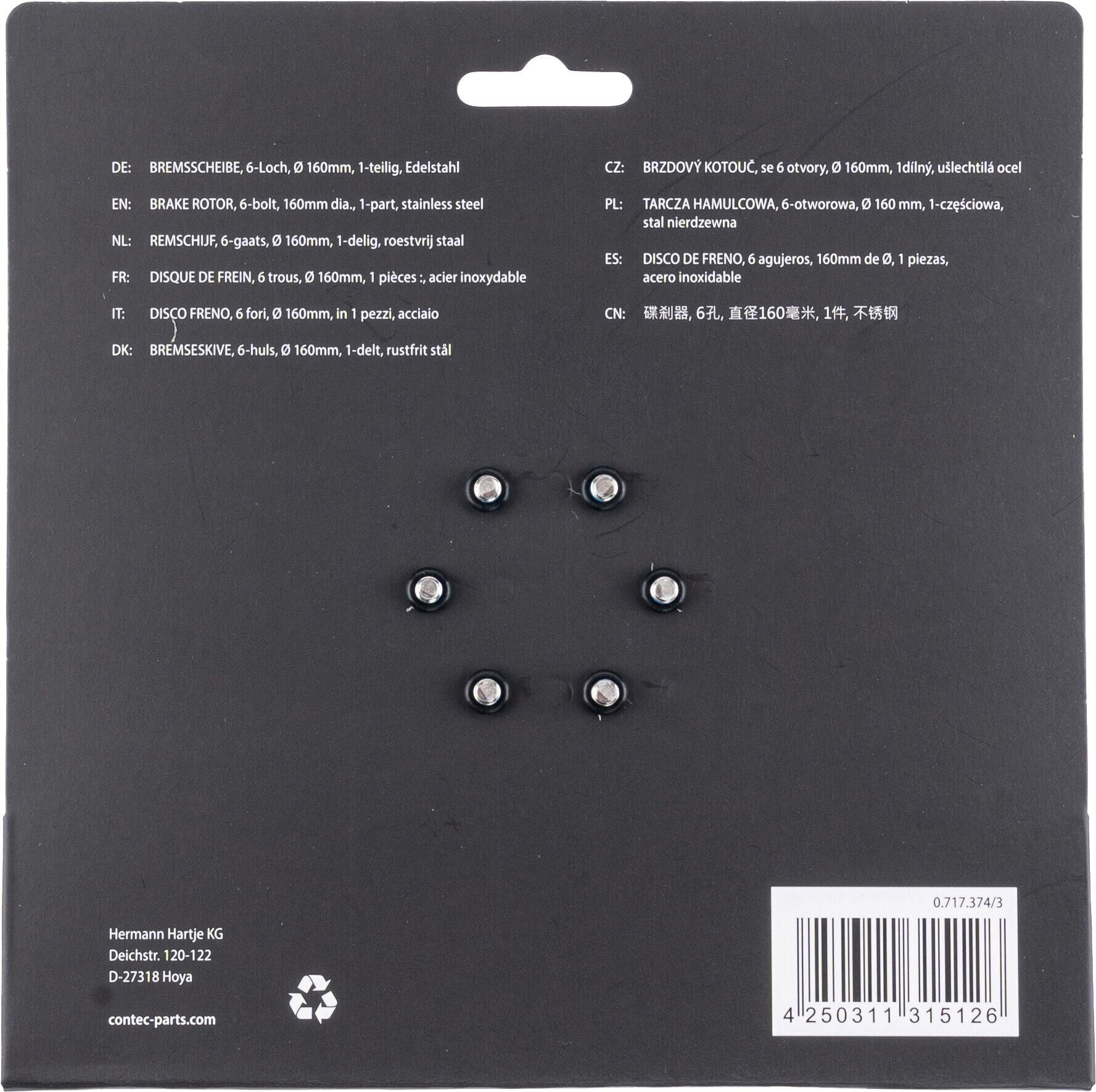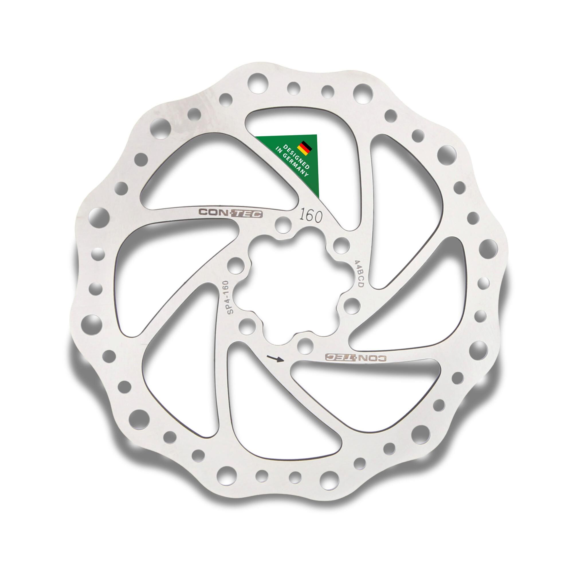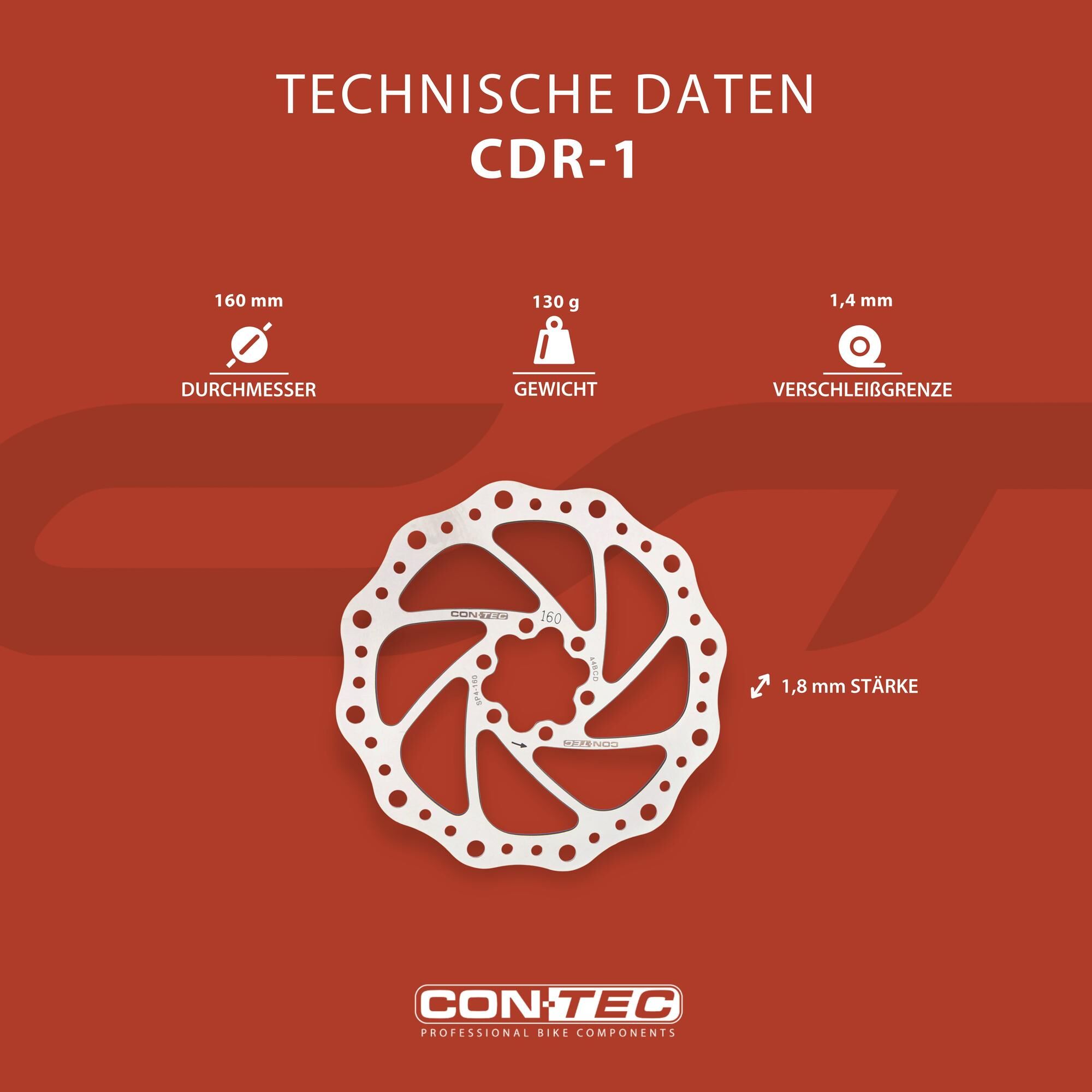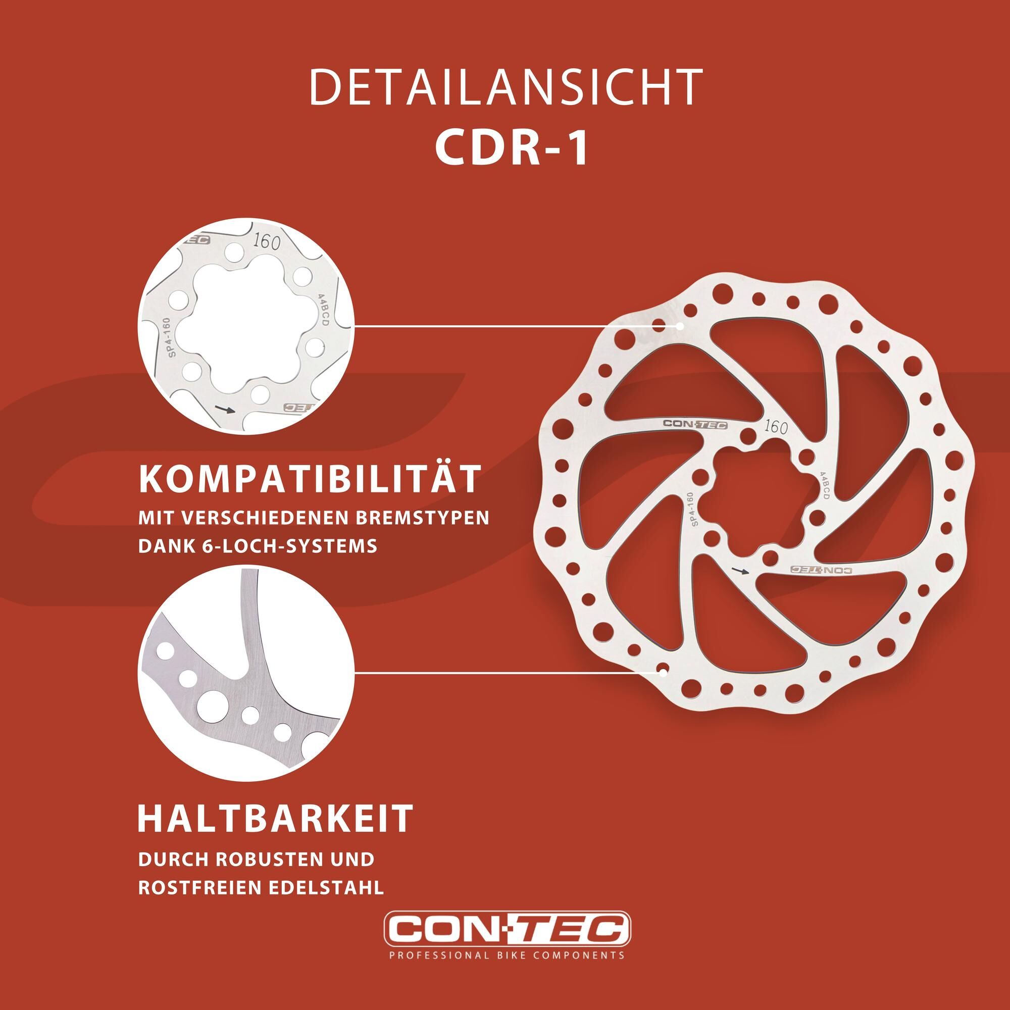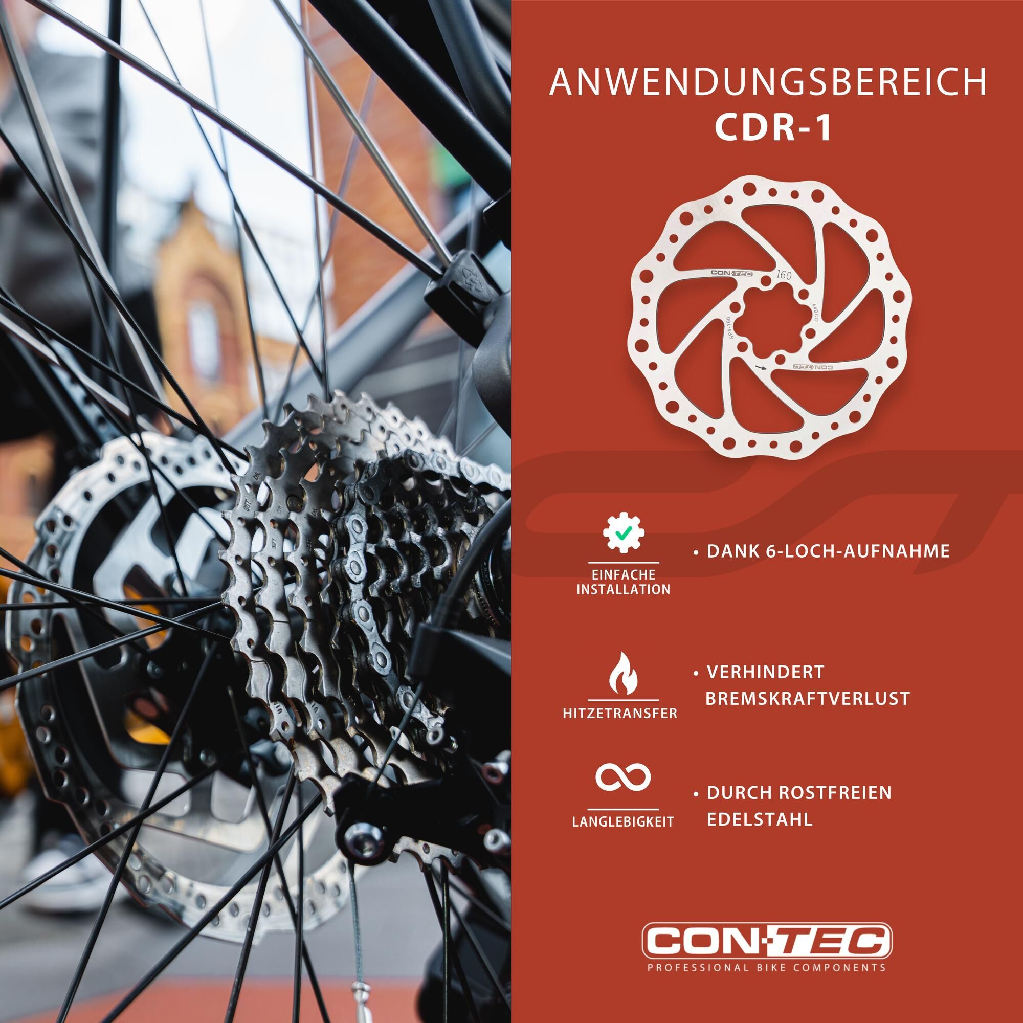 Für optimale VerzögerungMit dieser beliebten Bremsscheibe funktioniert die Verzögerung wieder reibungslos. Die "CDR-1" (CONTEC Disc Rotor) von CONTEC besteht aus Edelstahl. Ihre Discaufnahme erfolgt mit dem 6-Loch (IS)-System. Die silberne Scheibe lässt sich mit 6 Niro-Befestigungsschrauben anbringen. Sie gibt es mit einem Durchmesser von 140 mm bis 203 mm und mit einem Gewicht von 119 g bis 190 g.