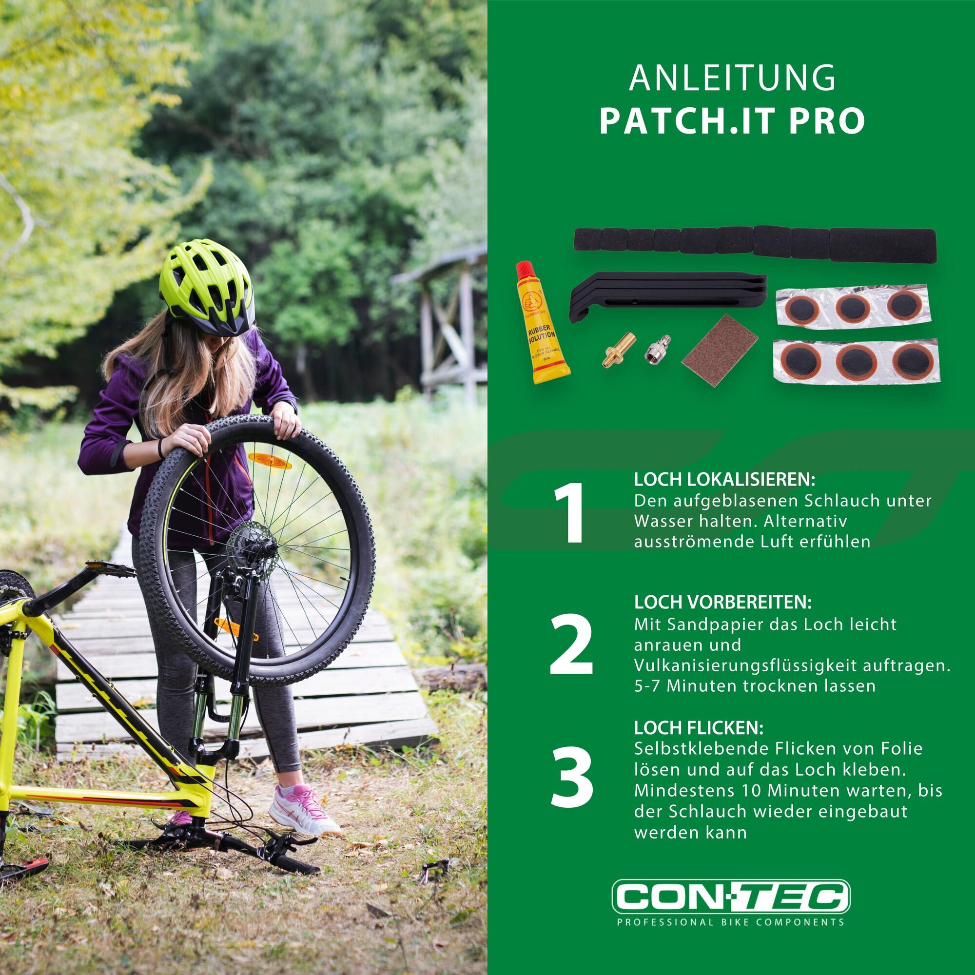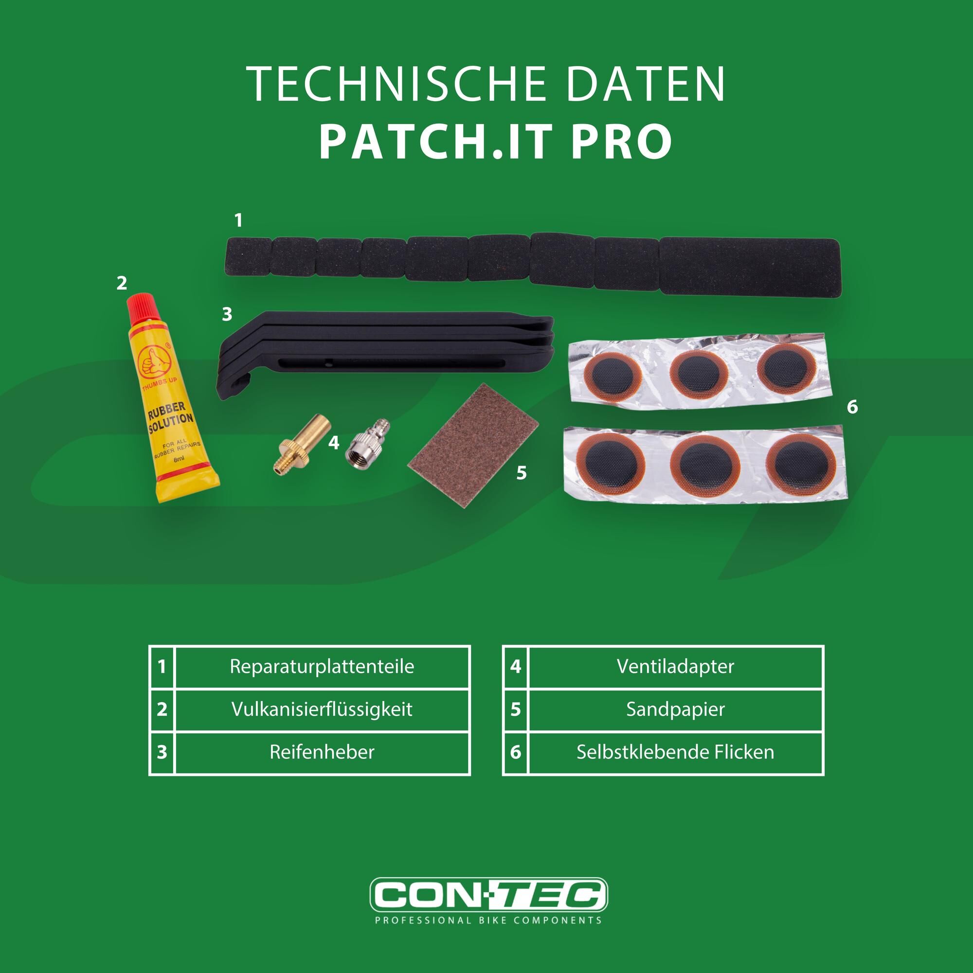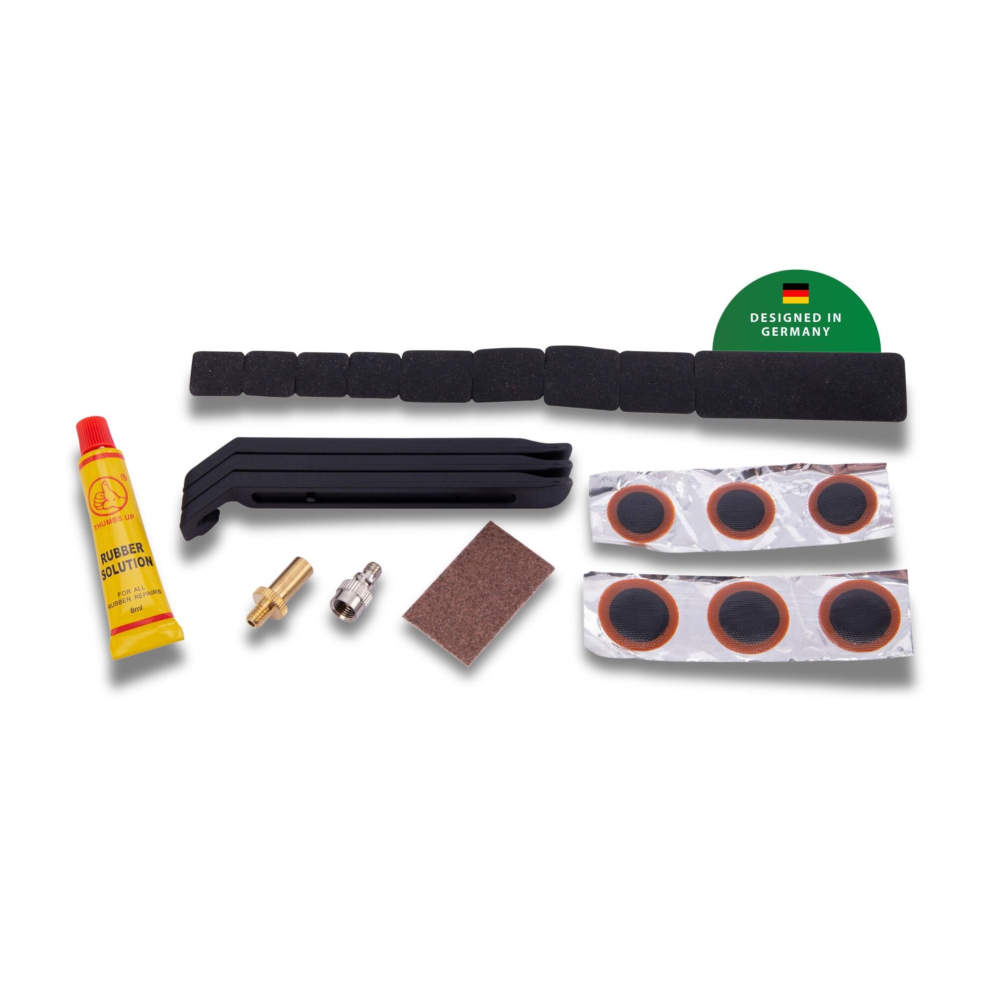 Flickzeug "Patch.it Pro" Das Flickzeug-Set "Patch.it Pro" besteht aus sechs Flicken, neun Reparaturplattenteilen, der Vulkanisierflüssigkeit und dem Sandpapier zum Aufrauen. Hinzukommen drei Reifenheber sowie Ventiladapter für Sclaverand und Autoventil.