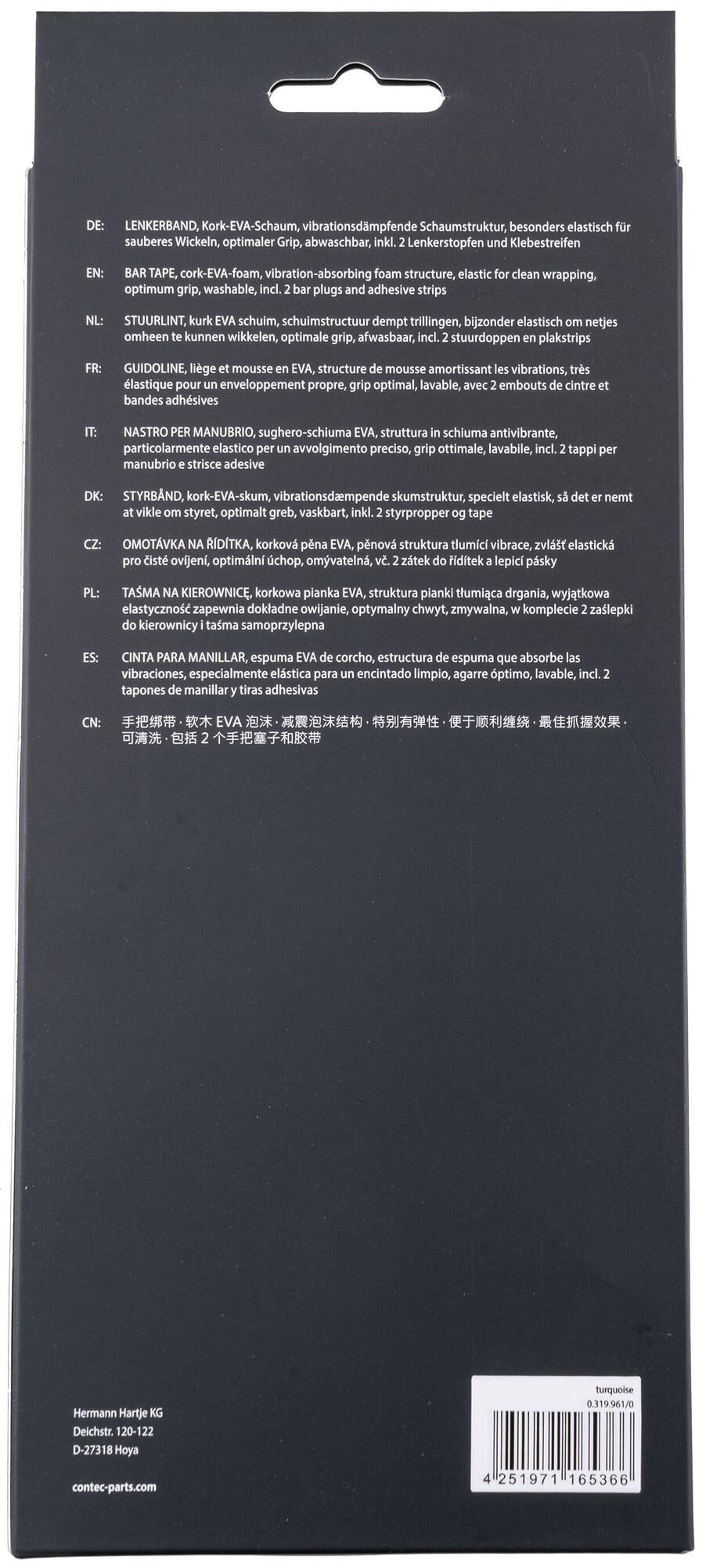 Klassisches Lenkerband aus Kork-EVA-Schaum, mit eingeprägtem CONTEC-Branding, Schaumstruktur dämpft Vibrationen und vermeidet Druckbelastungen erheblich, besonders elastisch für sauberes Wickeln, optimaler Grip, abwaschbar, einseitig eingeprägtes Logo erlaubt das Band wahlweise mit sichtbarem oder verdecktem CONTEC-Branding zu wickeln, inkl. 2 Lenkerstopfen und Klebestreifen zur Fixierung, Paar