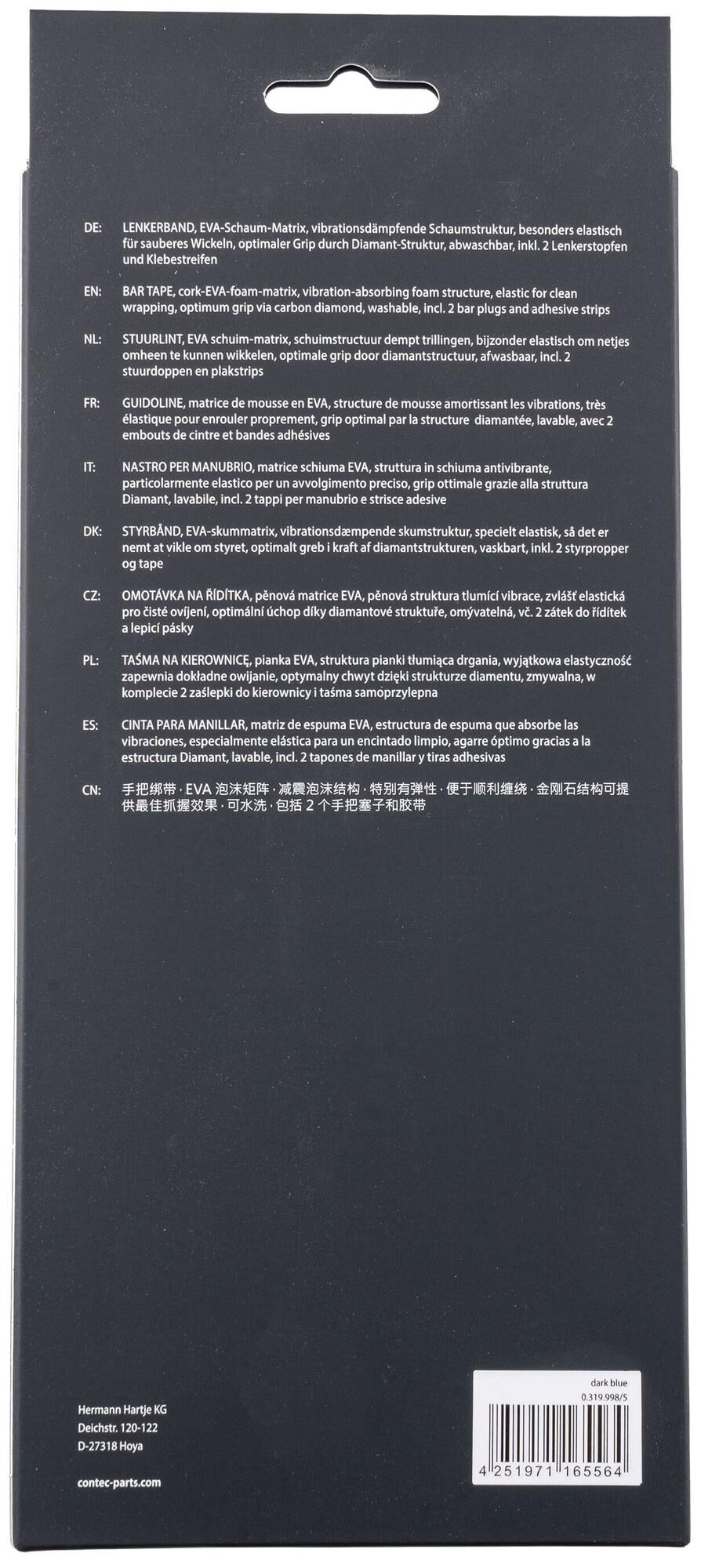 Lenkerband aus EVA-Schaum und Gel, mit eingeprägtem CONTEC-Branding, Schaumstruktur dämpft Vibrationen und vermeidet Druckbelastungen erheblich, besonders elastisch für sauberes Wickeln, optimaler Grip durch Diamanten-Struktur der Oberfläche, abwaschbar, einseitig eingeprägtes Logo erlaubt das Band wahlweise mit sichtbarem oder verdecktem CONTEC-Branding zu wickeln, inkl. 2 Lenkerstopfen und Klebestreifen zur Fixierung, Paar