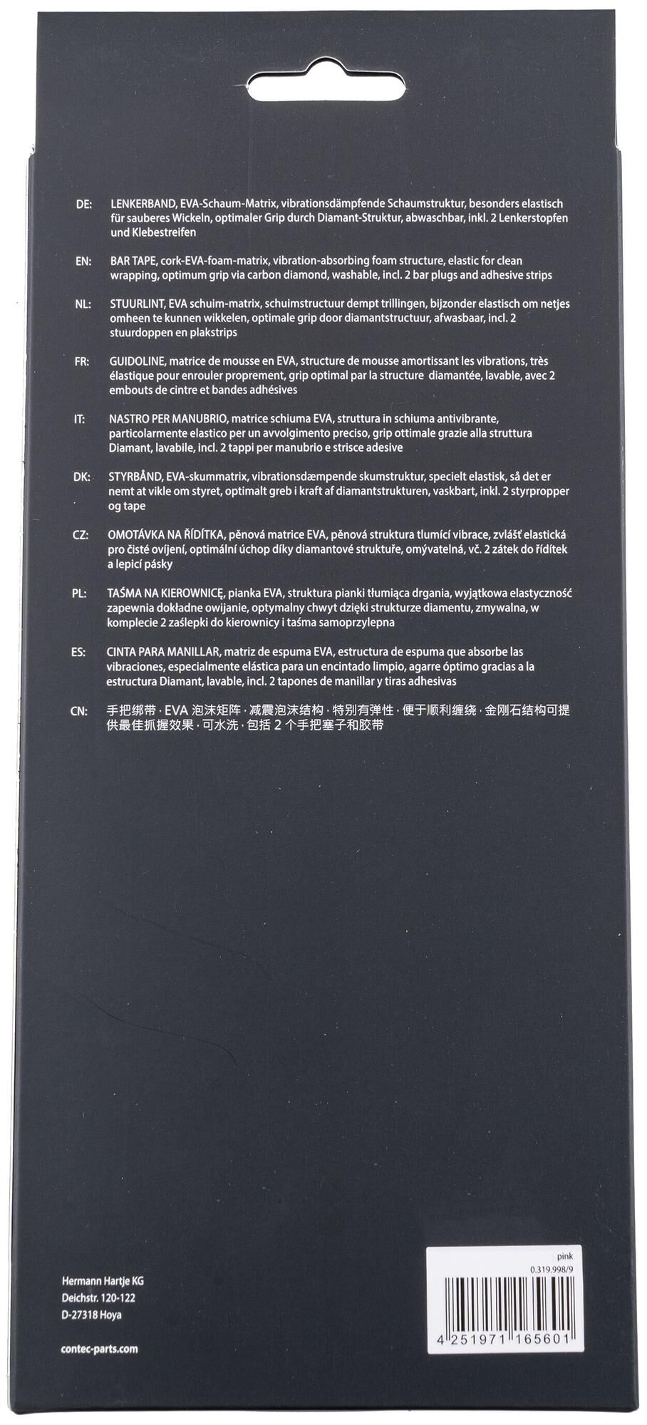 Lenkerband aus EVA-Schaum und Gel, mit eingeprägtem CONTEC-Branding, Schaumstruktur dämpft Vibrationen und vermeidet Druckbelastungen erheblich, besonders elastisch für sauberes Wickeln, optimaler Grip durch Diamanten-Struktur der Oberfläche, abwaschbar, einseitig eingeprägtes Logo erlaubt das Band wahlweise mit sichtbarem oder verdecktem CONTEC-Branding zu wickeln, inkl. 2 Lenkerstopfen und Klebestreifen zur Fixierung, Paar