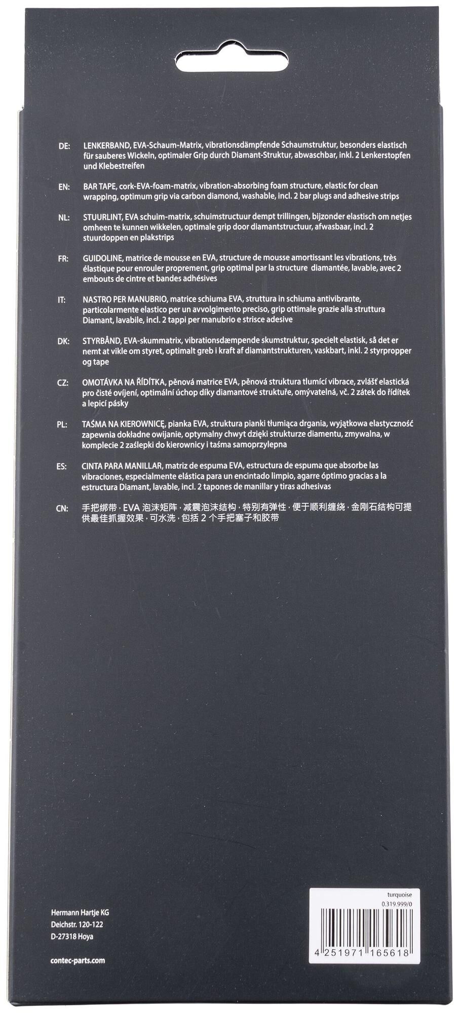 Lenkerband aus EVA-Schaum und Gel, mit eingeprägtem CONTEC-Branding, Schaumstruktur dämpft Vibrationen und vermeidet Druckbelastungen erheblich, besonders elastisch für sauberes Wickeln, optimaler Grip durch Diamanten-Struktur der Oberfläche, abwaschbar, einseitig eingeprägtes Logo erlaubt das Band wahlweise mit sichtbarem oder verdecktem CONTEC-Branding zu wickeln, inkl. 2 Lenkerstopfen und Klebestreifen zur Fixierung, Paar