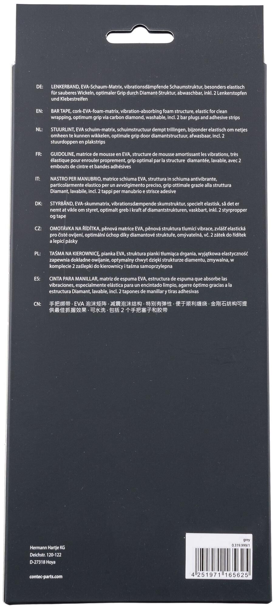 Lenkerband aus EVA-Schaum und Gel, mit eingeprägtem CONTEC-Branding, Schaumstruktur dämpft Vibrationen und vermeidet Druckbelastungen erheblich, besonders elastisch für sauberes Wickeln, optimaler Grip durch Diamanten-Struktur der Oberfläche, abwaschbar, einseitig eingeprägtes Logo erlaubt das Band wahlweise mit sichtbarem oder verdecktem CONTEC-Branding zu wickeln, inkl. 2 Lenkerstopfen und Klebestreifen zur Fixierung, Paar