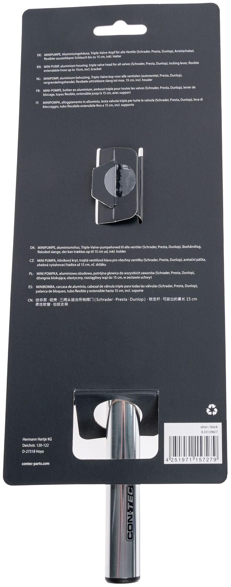Starke Pumpleistung, starker Look – die CONTEC Minipumpe Air Support Chrome II ist eine zuverlässige, kleine Begleitung aus Aluminium für deine Radtouren. Sie sorgt dafür, dass dem Fahrvergnügen nicht die Puste ausgeht: Mit nur wenigen Hüben erreicht die Air Support Chrome II einen Luftdruck bis zu 8 bar bzw. 120 psi. Somit eignet sie sich auch ideal für eine Hochdruck-Bereifung am Rennrad.Dank des Triple-Valve-Kopfes passt die Handpumpe auf jedes Auto- (AV), Presta- (SV) und Dunlop-Ventil (DV). Der herausziehbare, 15 cm lange Schlauch bietet dir beim Aufpumpen genügend Platz. Die Minipumpe lässt sich durch ihre kompakten Maße von nur 27 cm Länge und 19 mm Durchmesser ideal mitnehmen. Entweder ganz klassisch im Gepäck oder mithilfe der inkludierten Halterung, direkt an den Flaschenhalterösen deines Fahrrads.