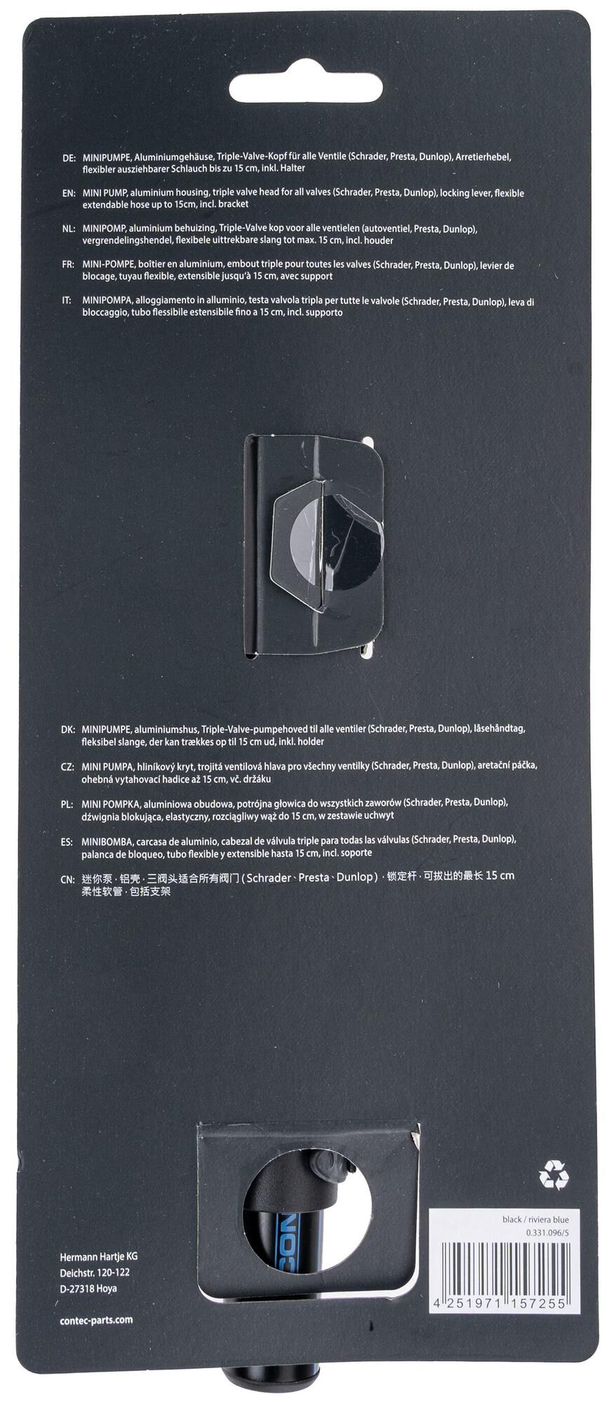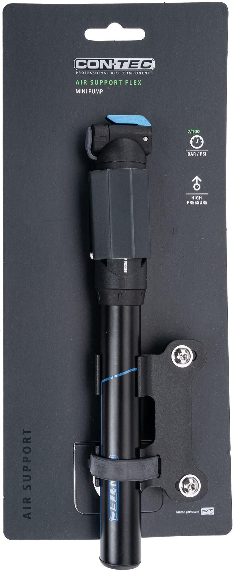 Ob für die alltägliche Fahrt zur Arbeit oder für eine längere Radtouren ist eine Minipumpe immer lohnenswert. Denn ist die Luft erstmal aus dem Reifen entwichen, gestaltet sich jeder Weg, unabhängig von seiner Länge, äußerst anstrengend. Die CONTEC Minipumpe Air Support Flex nimmt mit ihren 21 cm Länge auch nicht viel Platz im Gepäck weg. Dank ihres integrierten Halters für Flaschenhalterösen, kannst du sie sogar direkt an dein Bike montieren. Auch mit ihrer Pumpleistung kann die Air Support Flex so richtig „flexen“ (z.D. angeben): Bereits nach wenigen Hüben erreicht die Handpumpe bis zu 7 bar bzw. 100 psi Luftdruck. Das reicht locker aus, um jeden gewöhnlichen Fahrradreifen im Nullkommanichts zu füllen. Dabei brauchst du dir noch nicht einmal Gedanken darüber machen, ob die Pumpe auch zu deinem Bike passt, denn angesichts des Triple-Valve-Kopfes ist die Air Support Flex kompatibel mit den gängigen Auto- (AV), Presta- (SV) und Dunlop-Ventilen (DV). Ebenso flexibel gestaltet sich das Aufpumpen selbst dank des 15 cm langen, herausziehbaren Schlauchs. Die Handpumpe besteht aus Aluminium und Kunststoff und ist in zwei Farben erhältlich.