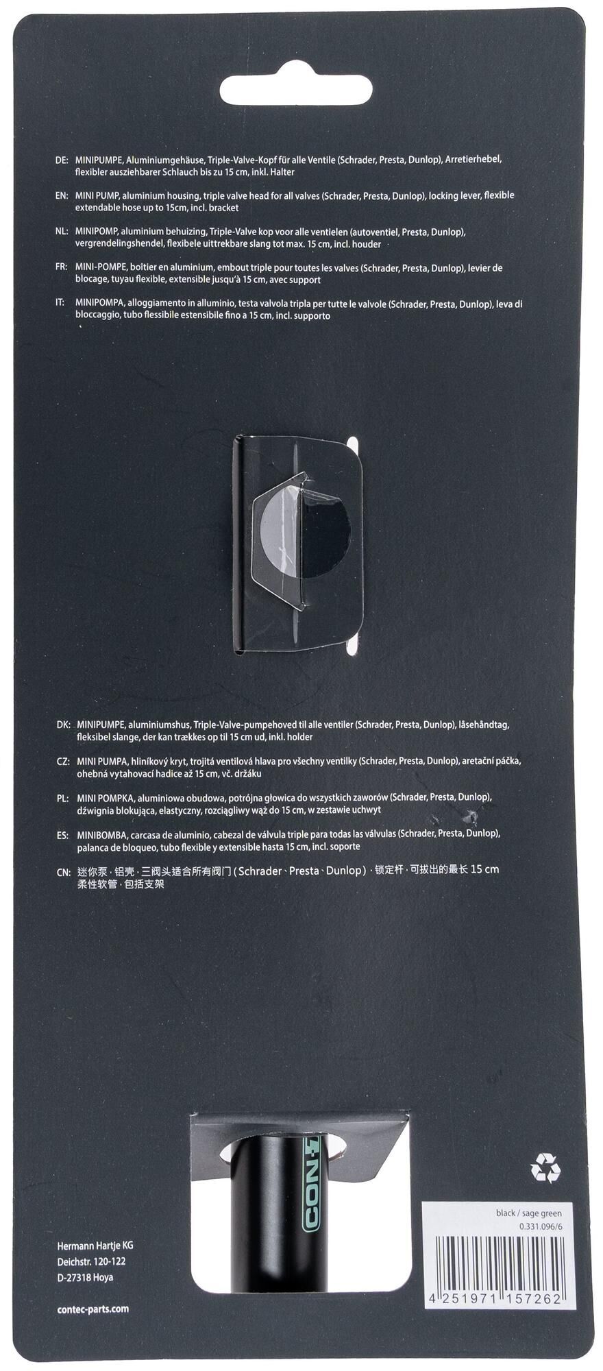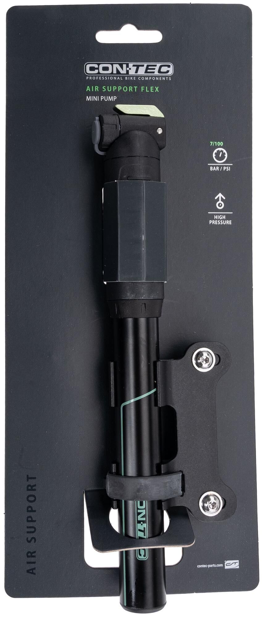 Ob für die alltägliche Fahrt zur Arbeit oder für eine längere Radtouren ist eine Minipumpe immer lohnenswert. Denn ist die Luft erstmal aus dem Reifen entwichen, gestaltet sich jeder Weg, unabhängig von seiner Länge, äußerst anstrengend. Die CONTEC Minipumpe Air Support Flex nimmt mit ihren 21 cm Länge auch nicht viel Platz im Gepäck weg. Dank ihres integrierten Halters für Flaschenhalterösen, kannst du sie sogar direkt an dein Bike montieren. Auch mit ihrer Pumpleistung kann die Air Support Flex so richtig „flexen“ (z.D. angeben): Bereits nach wenigen Hüben erreicht die Handpumpe bis zu 7 bar bzw. 100 psi Luftdruck. Das reicht locker aus, um jeden gewöhnlichen Fahrradreifen im Nullkommanichts zu füllen. Dabei brauchst du dir noch nicht einmal Gedanken darüber machen, ob die Pumpe auch zu deinem Bike passt, denn angesichts des Triple-Valve-Kopfes ist die Air Support Flex kompatibel mit den gängigen Auto- (AV), Presta- (SV) und Dunlop-Ventilen (DV). Ebenso flexibel gestaltet sich das Aufpumpen selbst dank des 15 cm langen, herausziehbaren Schlauchs. Die Handpumpe besteht aus Aluminium und Kunststoff und ist in zwei Farben erhältlich.