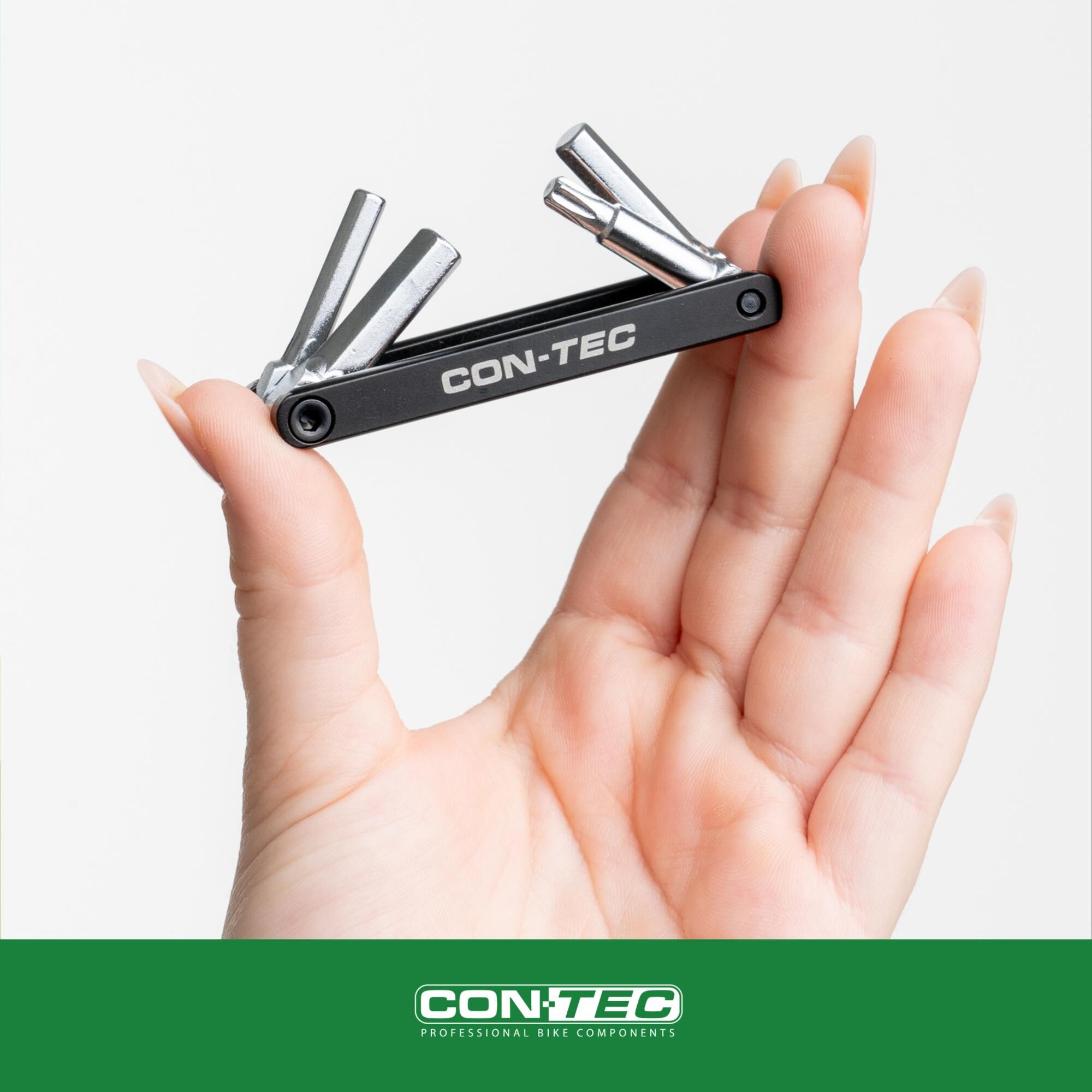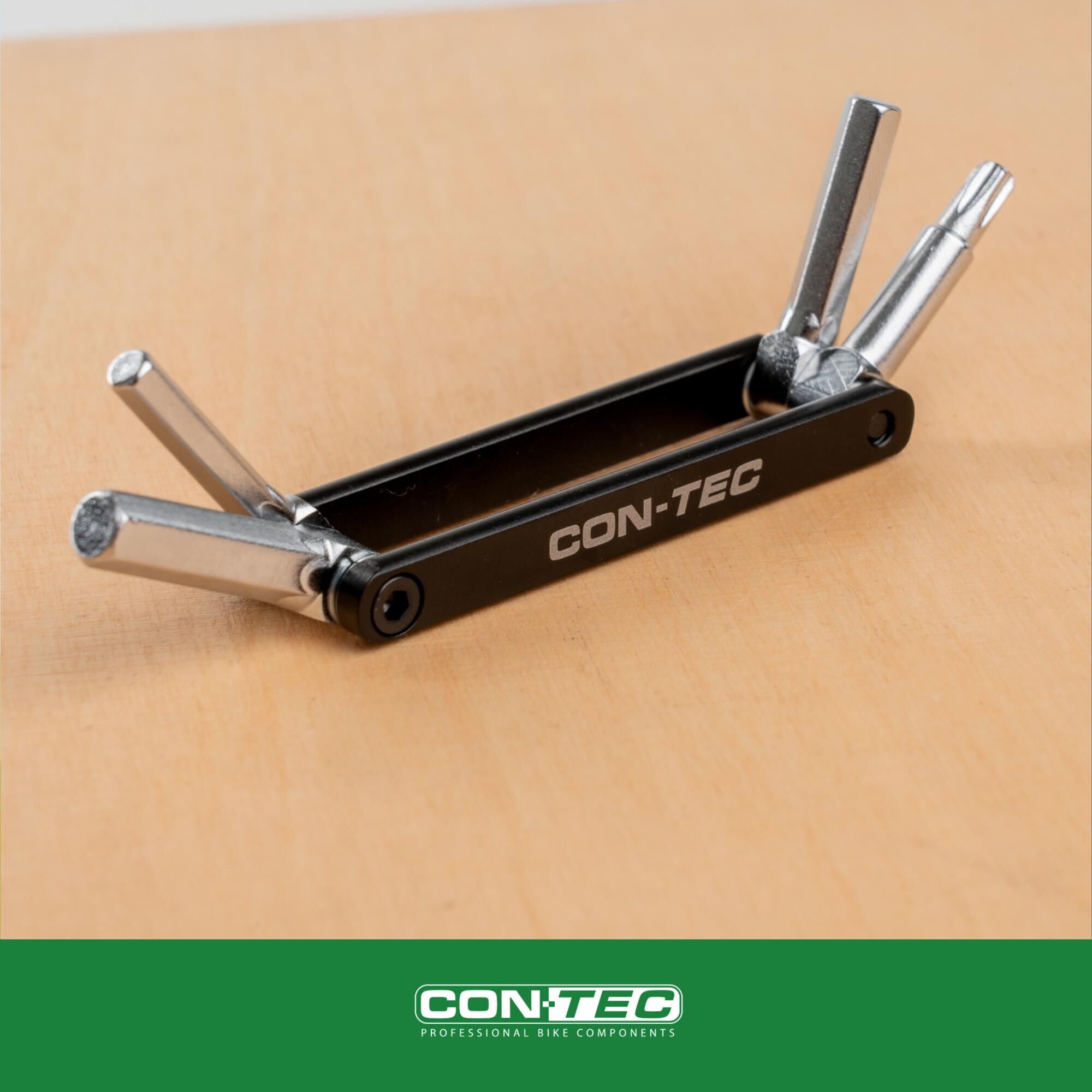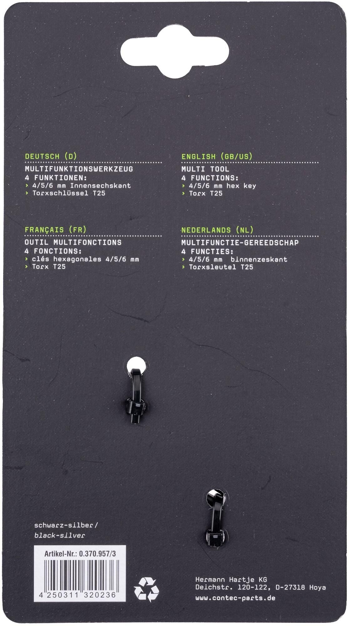 Hochwertiges Multitool für jedes FahrradWer oft mit dem Fahrrad unterwegs ist, kommt nicht ohne das passende Werkzeug aus. Das vielseitige CONTEC Multifunktionswerkzeug "Micro Gadget - MG1" überzeugt durch sein flaches und ultrakompaktes Design, wodurch es in jede Hosentasche passt.Das Qualitätsprodukt aus dem Hause CONTEC bietet insgesamt 4 Funktionen. Es beinhaltet jeweils einen 4, 5 und 6 mm-Innensechskantschlüssel sowie einen Innensechsrund-Schlüssel T25. Für viele kleine Reparaturen und Nachjustierungen ist das Multitool somit der ideale Begleiter.1 = T25 Innensechsrundschlüssel2 = 5 mm Innenschskantschlüssel3 = 6 mm Innensechskantschlüssel4 = 4 mm Innensechskantschlüssel
