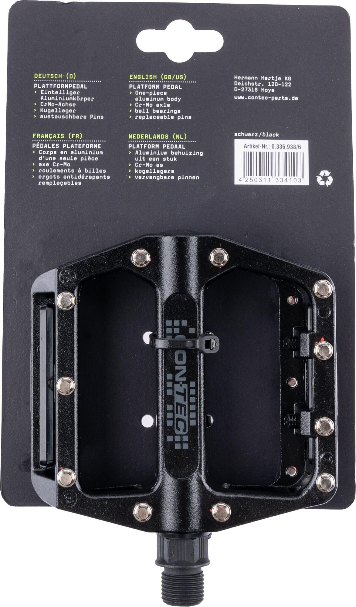 Unschlagbar im GeländeGerade bei steilen und längeren Anstiegen mit dem MTB auf dem Trail, im Bikepark oder bei längeren Touren in unwegsamem Gelände sorgt eine größere Trittfläche des Pedals für verbesserte Ergonomie, mehr Sicherheit und eine effizientere Kraftübertragung. Das CONTEC Plattform-Pedal "2Black" ist auf diese Ansprüche perfekt abgestimmt: Der einteilige Aluminium-Körper bietet eine großzügige Trittfläche und eine hohe Verwindungssteifigkeit unter hohen Belastungen bei einem Gesamtgewicht beider Pedale von nur 420 g. Zur Langlebigkeit und Stabilität des Pedals trägt auch die robuste Achse aus hochwertigem CrMo-Stahl mit dem gängigen 9/16"-Gewinde bei. Diese Stahllegierung zeichnet sich durch eine hohe Zähigkeit und Bruchsicherheit aus, was bei den hohen Dauerbelastungen im Mountainbike-Sport ein Plus an Sicherheit und Zuverlässigkeit ist. Dabei sorgen leichtgängige Kugellager für einen geschmeidigen Lauf und guten Vortrieb. Das CONTEC-Plattform-Pedal "2Black" ist zudem durch abnehmbare Reflektoren und austauschbare Pins (R-Pins) an die persönlichen Bedürfnisse auf und abseits des Trails anpassbar und langfristig ohne Abstriche nutzbar. Verloren gegangene oder abgenutzte Pins können einfach durch neue ein- oder verschiedenfarbige R-Pins ersetzt werden, die mit dem mitgelieferten Schraubenschlüssel in die dafür vorgesehenen Gewinde eingeschraubt werden. Das Plattform-Pedal "2Black" wird durch die Verwendung hochwertiger und robuster Materialien und sinnvollen Features den hohen Ansprüchen und Anforderungen begeisterter Mountainbiker gerecht. Es ist ein ideales Upgrade für jedes MTB.