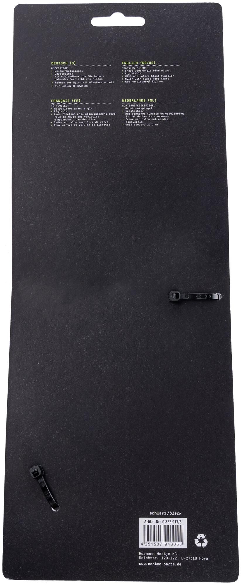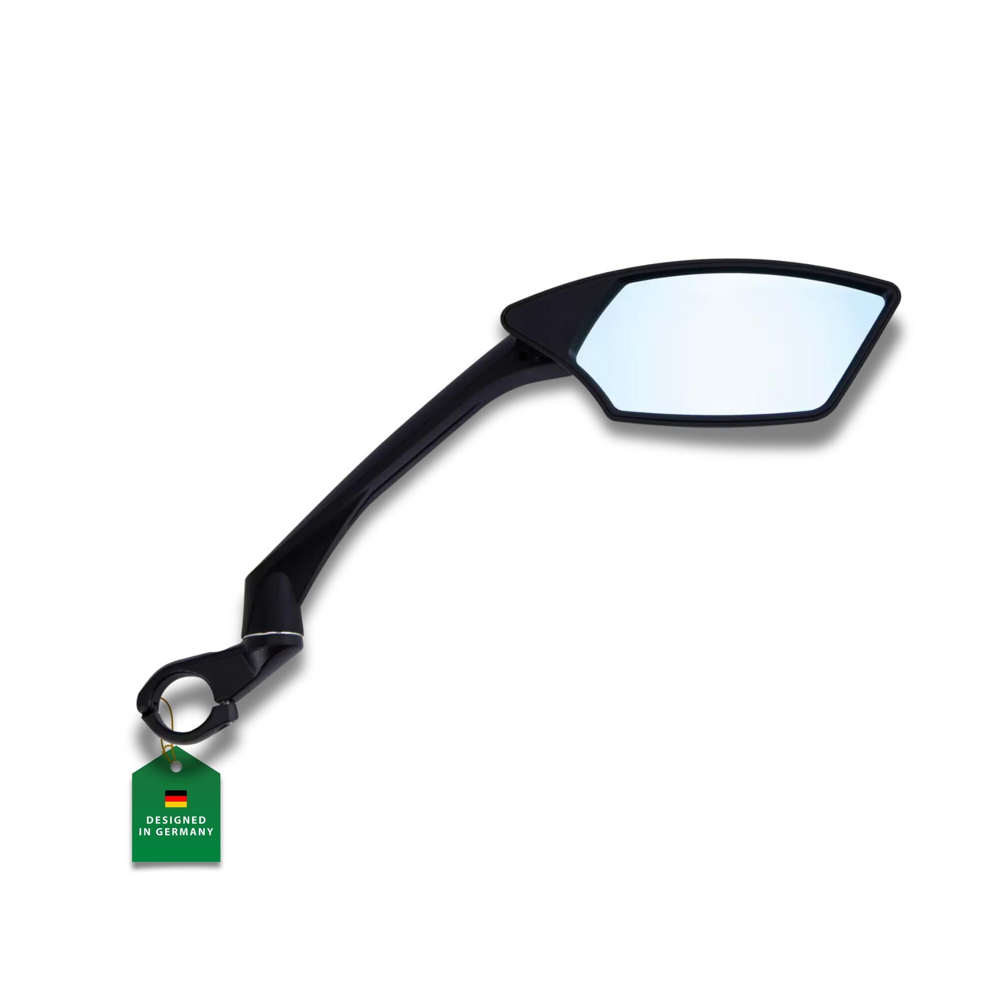 Mit Dazz Linse (bis zu 75 % weniger Reflexion), durch das Gelenk an der Schelle und dem Versatz nach hinten auch kompatibel mit E-Bike Displays (z.B. Bosch Intuvia),verstellbarer Weitwinkelspiegel mit Abblendfunktion für herannahendes Fernlicht von hinten, Rahmen aus Nylon mit Glasfaseranteil, schwarz