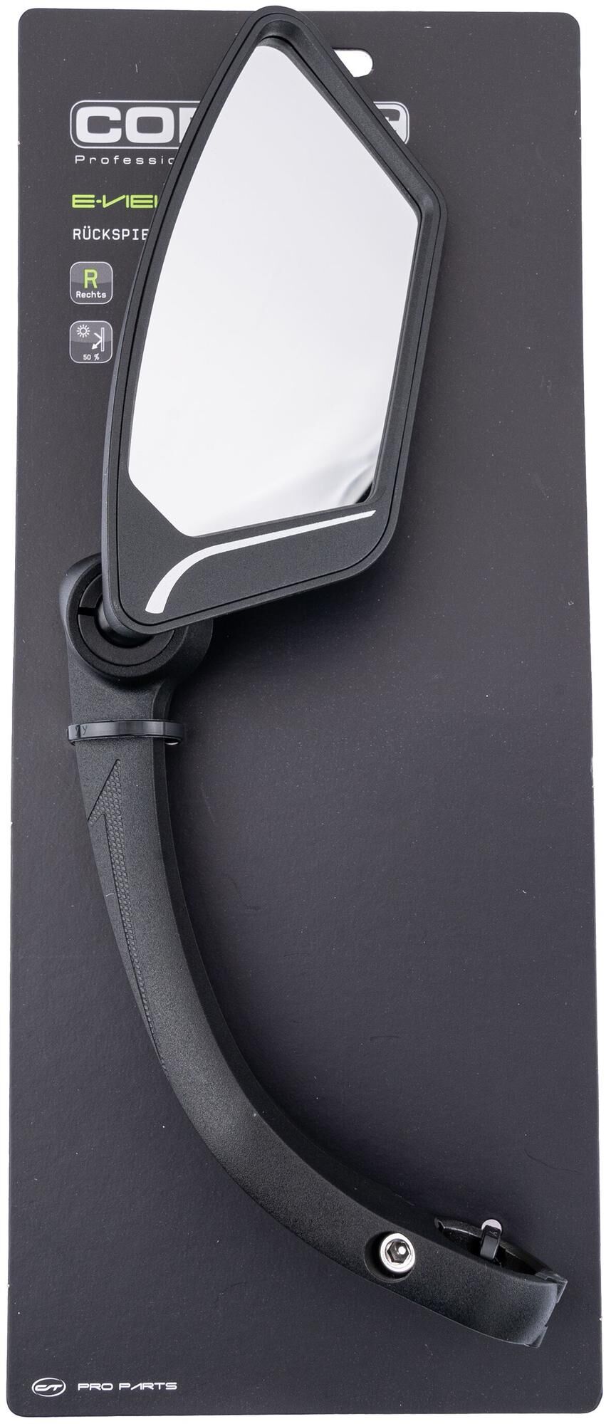 Alles schnell im ÜberblickDer Rückspiegel "E-View" verleiht eine hervorragende Übersicht auf dem E-Bike oder Fahrrad. Die Besonderheit liegt hier im um 360° verstellbaren Spiegelkopf mit Edelstahllinse. Dadurch haben Sie alles um sich herum sehr gut im Blick. Ausgestattet ist der Spiegel mit der Glare Linse, dank der um bis zu 50 % weniger Reflexion aufkommt. Dieser Rückspiegel, der sich wunderbar für E-Bikes eignet, verfügt über einen robusten Nylon-Rahmen mit Glasfaser-Anteil. Er ist für Lenker mit einem Durchmesser von 22,2 mm geeignet.Den "E-View" von CONTEC gibt es sowohl zur Montage auf der linken als auch zur Befestigung auf der rechten Seite.