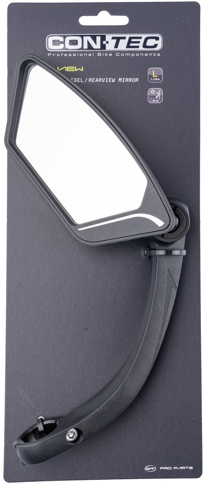 Alles schnell im ÜberblickDer Rückspiegel "E-View" verleiht eine hervorragende Übersicht auf dem E-Bike oder Fahrrad. Die Besonderheit liegt hier im um 360° verstellbaren Spiegelkopf mit Edelstahllinse. Dadurch haben Sie alles um sich herum sehr gut im Blick. Ausgestattet ist der Spiegel mit der Glare Linse, dank der um bis zu 50 % weniger Reflexion aufkommt. Dieser Rückspiegel, der sich wunderbar für E-Bikes eignet, verfügt über einen robusten Nylon-Rahmen mit Glasfaser-Anteil. Er ist für Lenker mit einem Durchmesser von 22,2 mm geeignet.Den "E-View" von CONTEC gibt es sowohl zur Montage auf der linken als auch zur Befestigung auf der rechten Seite.