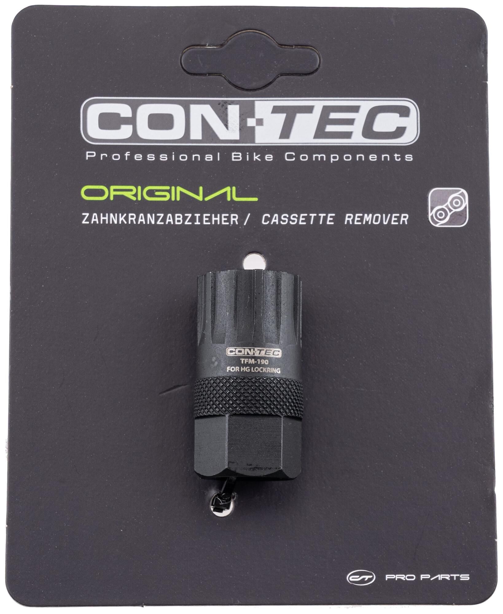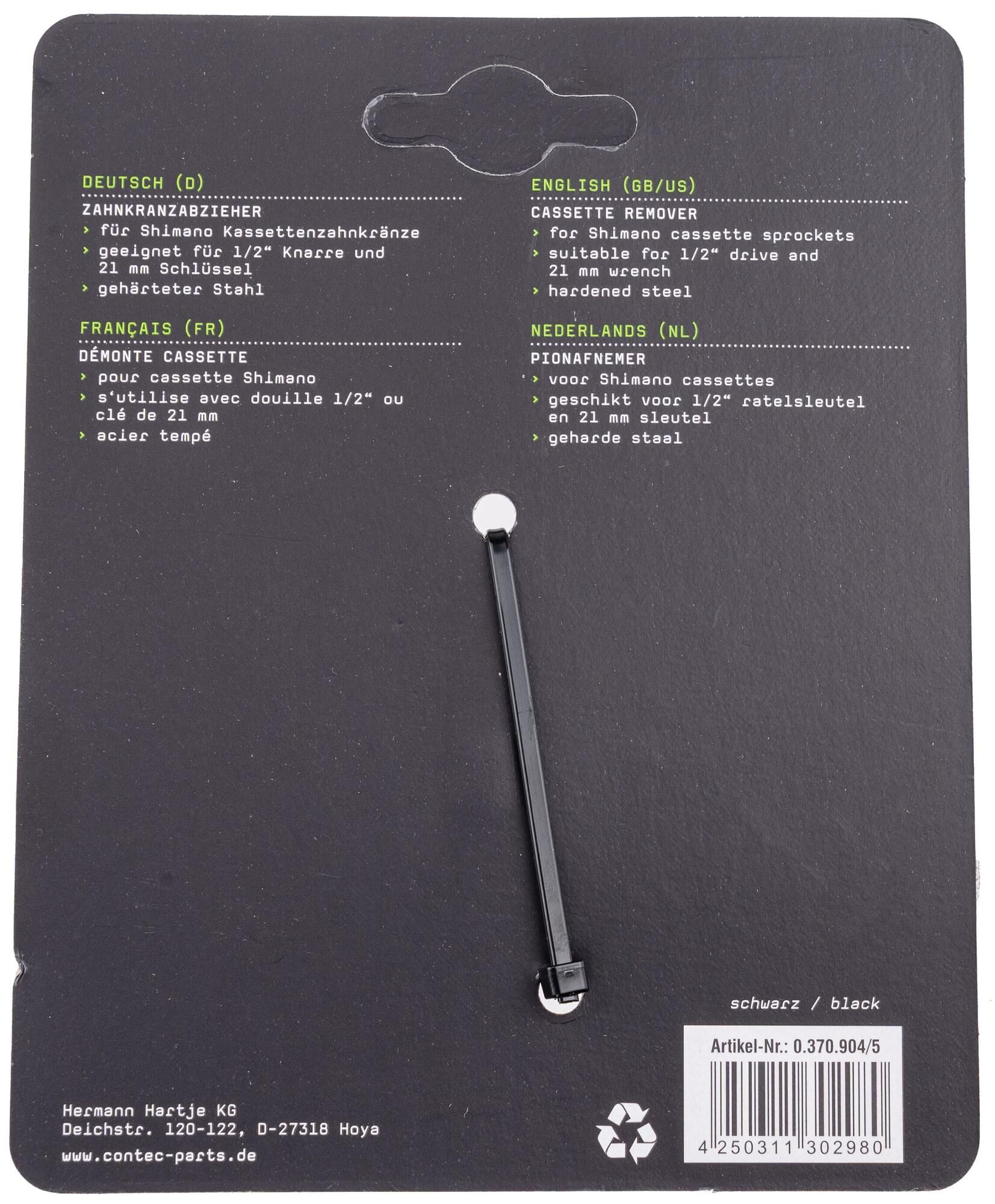 So funktioniert die professionelle AntriebsreparaturWerkzeug für SHIMANO Kassettenzahnkränze gesucht? Der CONTEC Zahnkranzabzieher eignet sich perfekt zur Montage und Demontage von SHIMANO Zahnkränzen. Das Werkzeug wird einfach mit der gerieften Seite in die Befestigungsschraube der Kassette am ausgebauten Hinterrad gesteckt und kann dann mit einer 1/2" Knarre oder einem 21 mm Schlüssel geöffnet werden. Währenddessen wird die Kassette dabei mit einer Kettenpeitsche fixiert. Das Profi-Werkzeug für alle Fahrräder mit gängigen SHIMANO Kassetten.