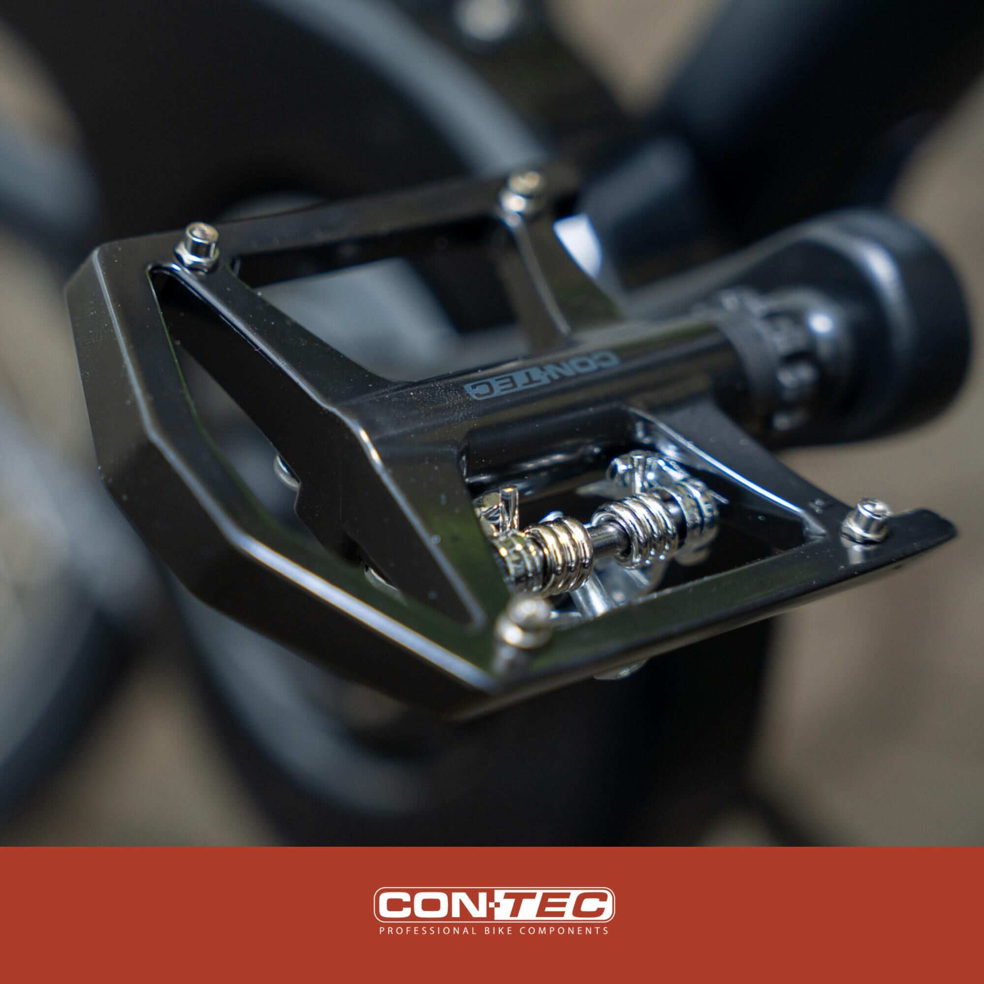 MTB / trail, replaceable pins, one-piece aluminium housing, function and reliability of the SPD system, the open design gives mud and sludge deposits little chance, more control over large footsurface, sealed compact axle bearing unit, on both sides CrMo-connection with adjustable spring tension, dimensions: 104 x 85mm, approx. 386g