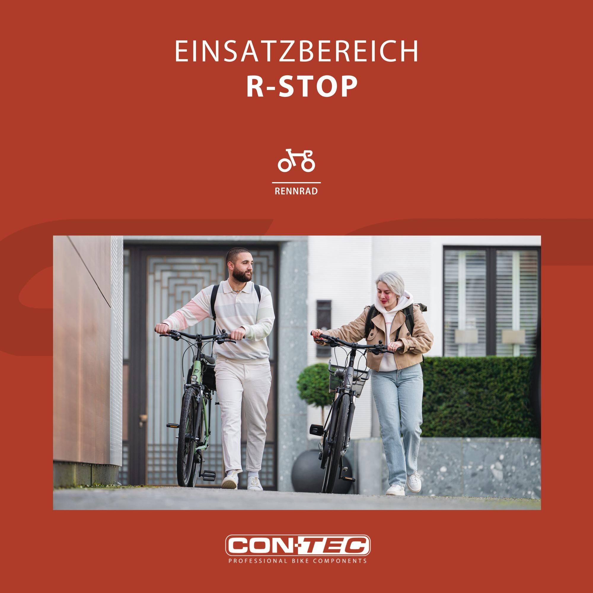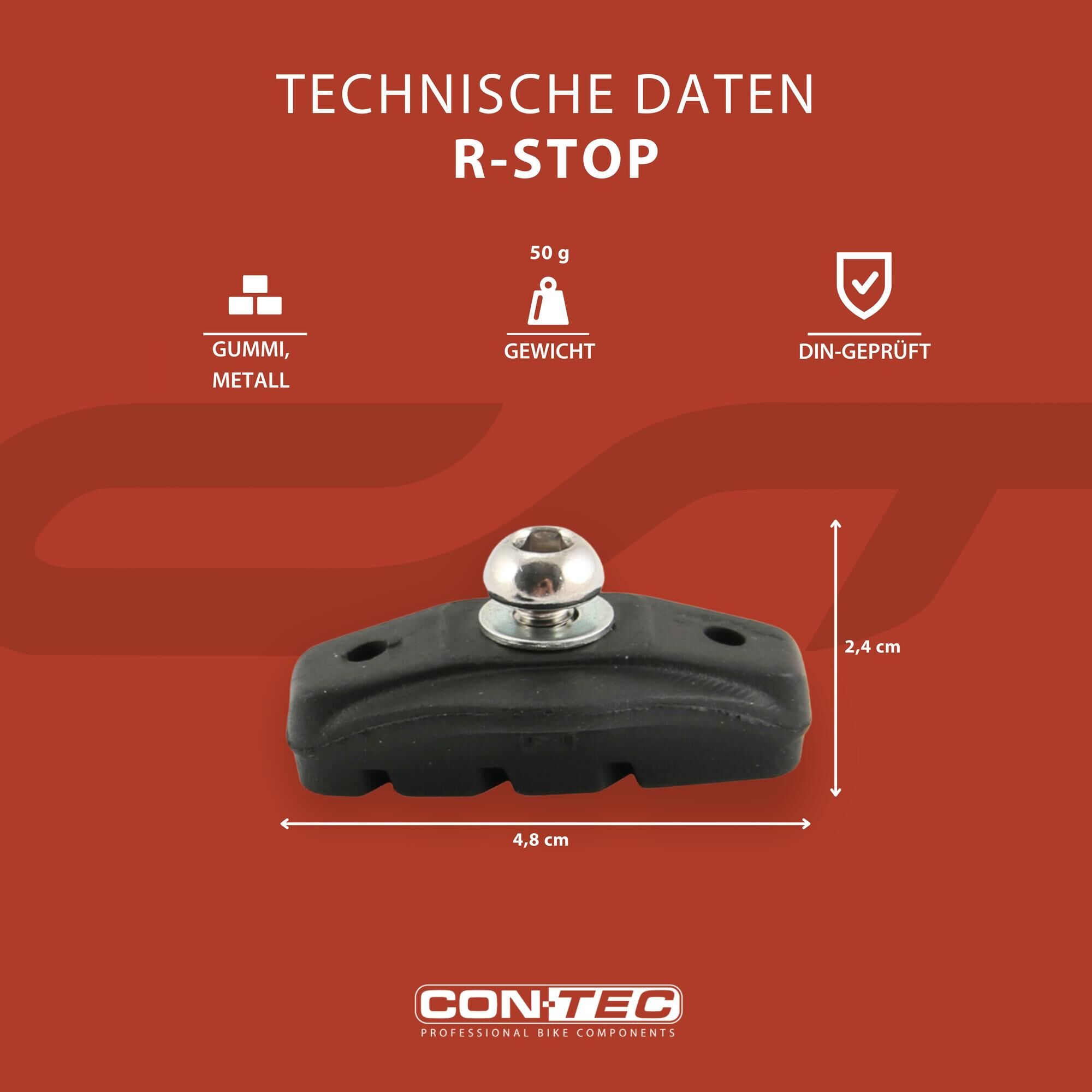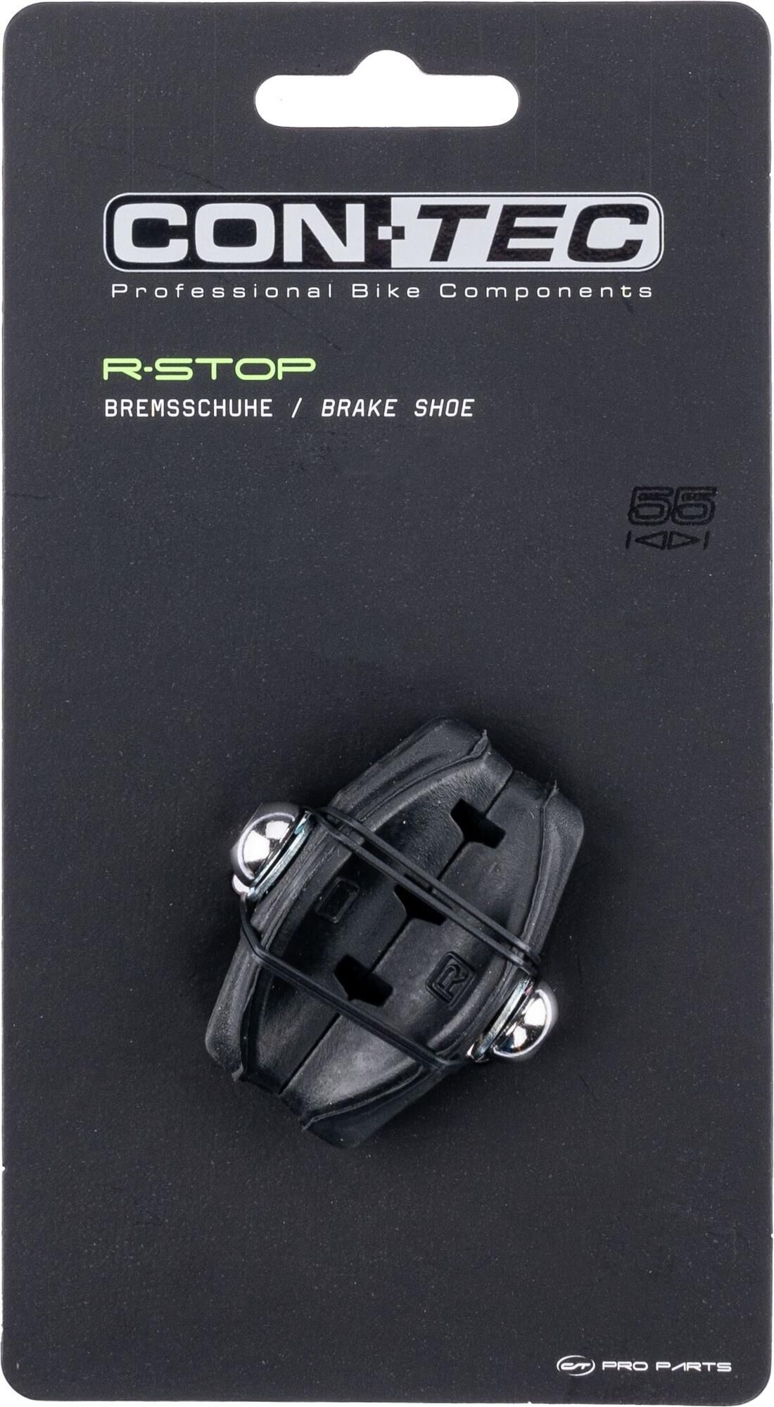 The right rubber compound makes the difference. High-quality brake shoes provide improved braking performance and longer rim life. A medium-hard rubber compound is ideal for bikes that are ridden daily in every type of weather.The CONTEC brake shoe "R-Stop" for side and centre-pull brakes offers DIN-tested quality and meets these requirements. The practical adjustment handles on the brake pad mount also make it particularly easy to install the brake shoes on the brake arms and to adjust the brake easily. The brake shoes can therefore be compressed in the locked state on the brake body, in order to then tighten the cable.The Medium Compound pads made of a medium-hard rubber mixture and a length of 55 mm ensure good contact with the brake track with a grippy profile.The CONTEC brake shoe "R-Stop" in a stylish black is available in pairs and is perfect for bicycles with aluminium rims.