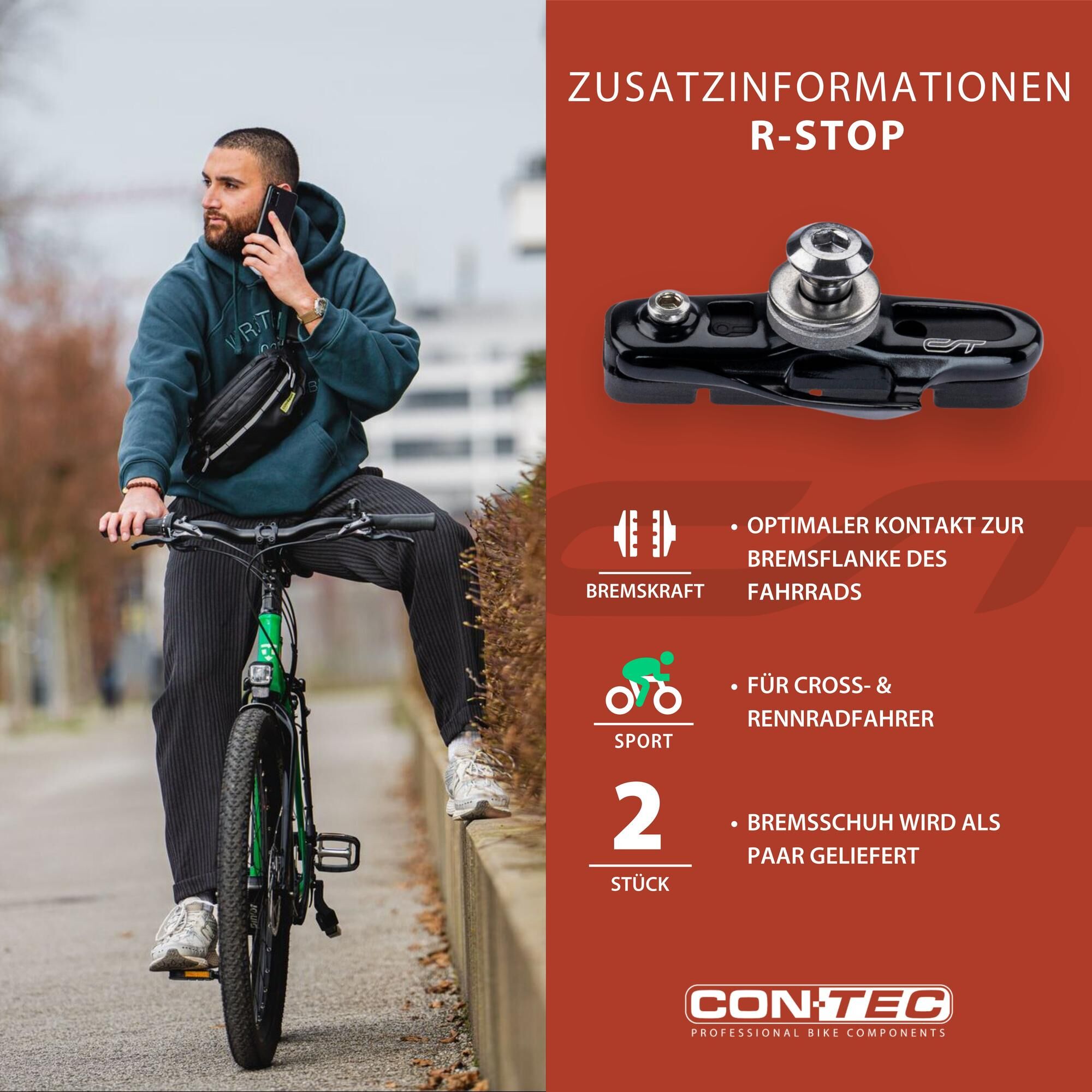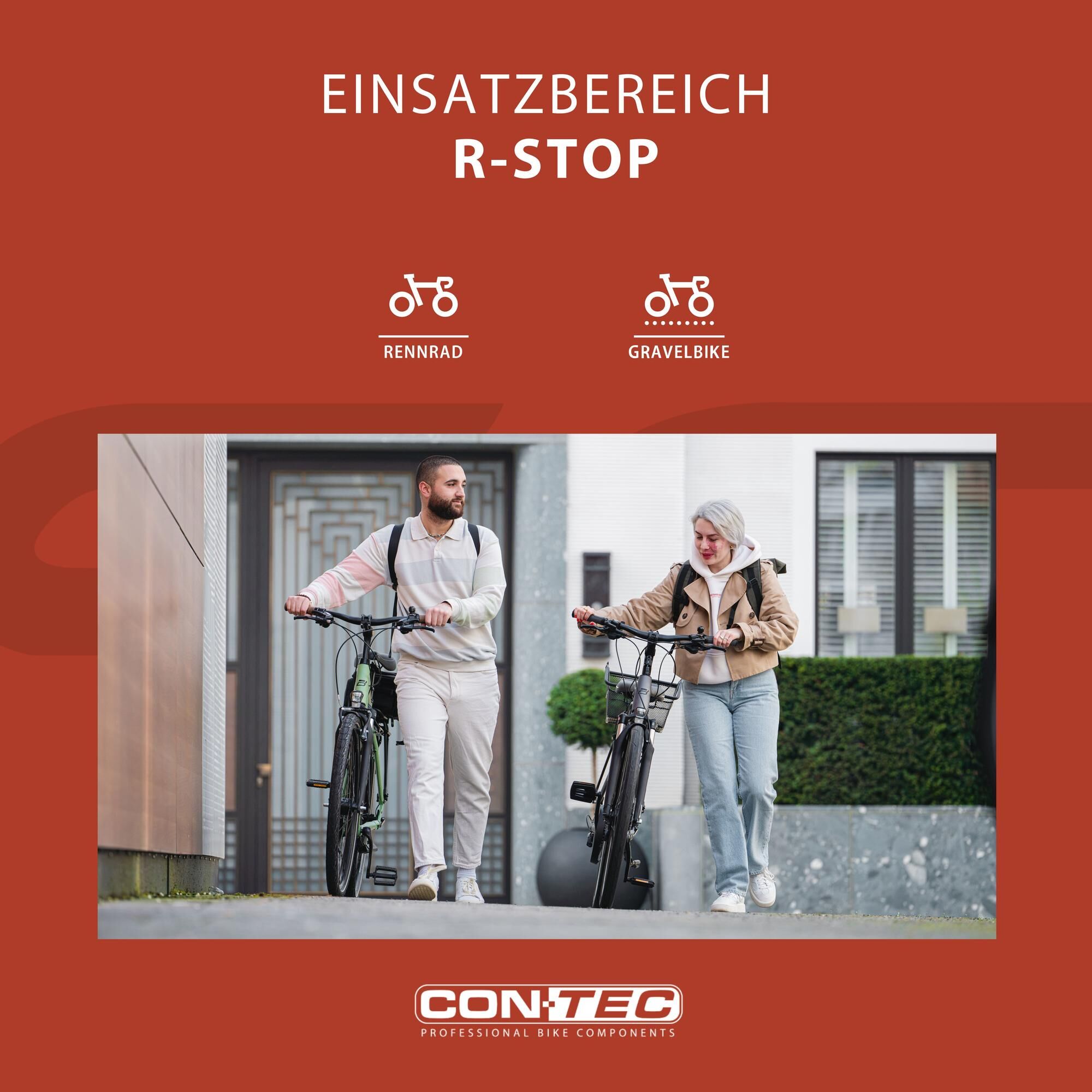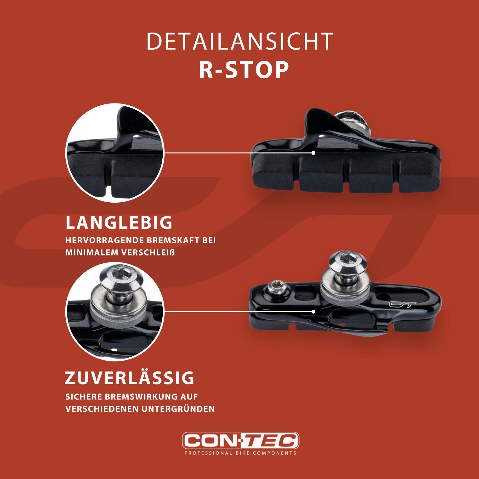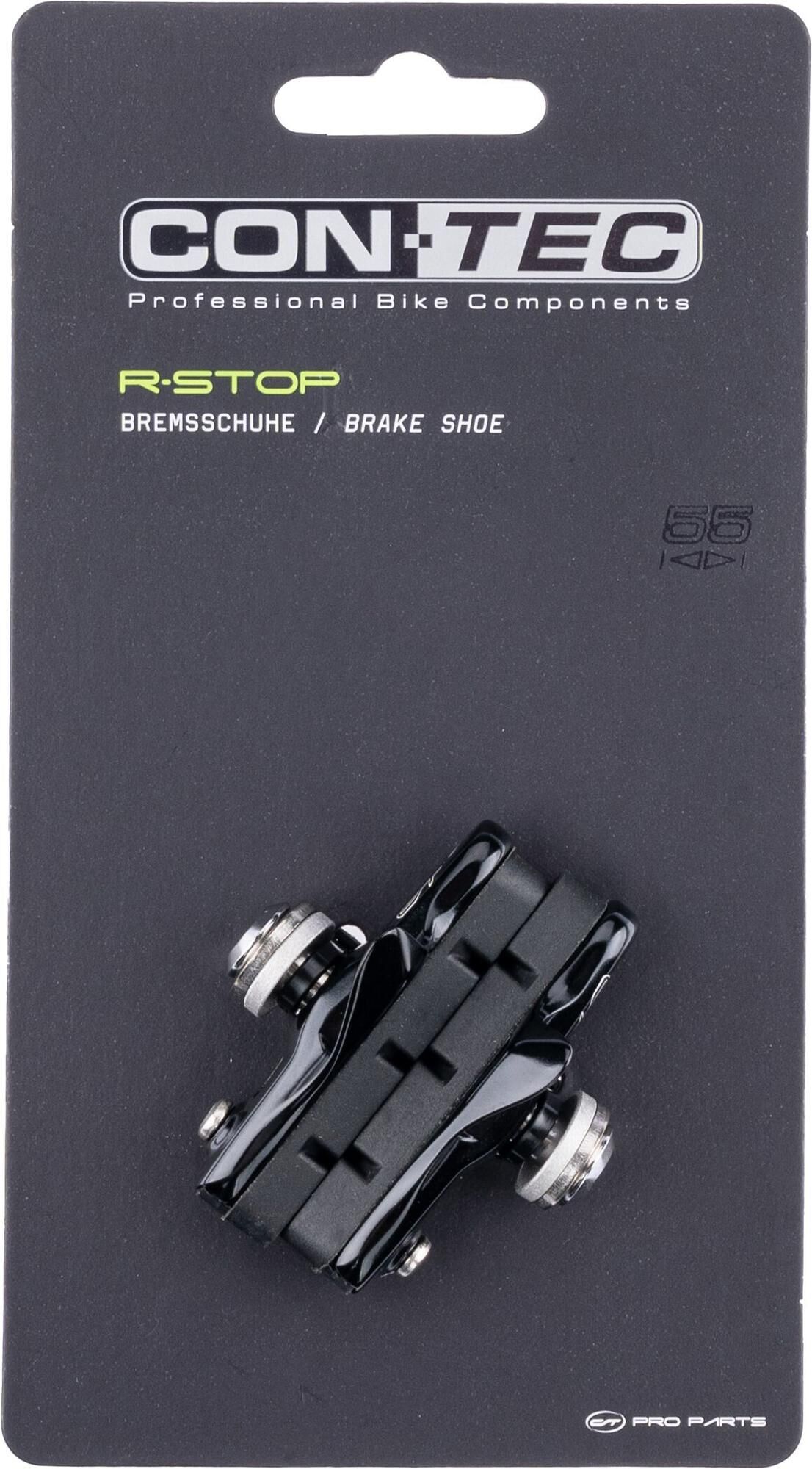 Best braking performance for fast bikesAnyone looking for a challenge with their cyclocross or road bike should not compromise when it comes to the choice of brake pads.The CONTEC brake shoe "R-Stop" in a discreet black is DIN-tested and gets the best out of side and centre-pull brakes. The medium compound made of a medium-hard rubber ensures optimum deceleration during braking and minimal wear in various weather conditions.With the brake pads being 55 mm long each, good contact with the brake track of the bicycle is always ensured. In addition, the practical cartridge pads are easily replaceable: Worn pads are easily removed from the brake shoes with an Allen key and can be easily replaced - disassembly and realignment of the brake shoes is therefore not necessary.Thanks to their excellent braking properties, their reliability in all weather conditions and the easy replacement of cartridge brake pads, the CONTEC brake shoes "R-Stop" are particularly suitable for sporty road and cyclocross bikes.