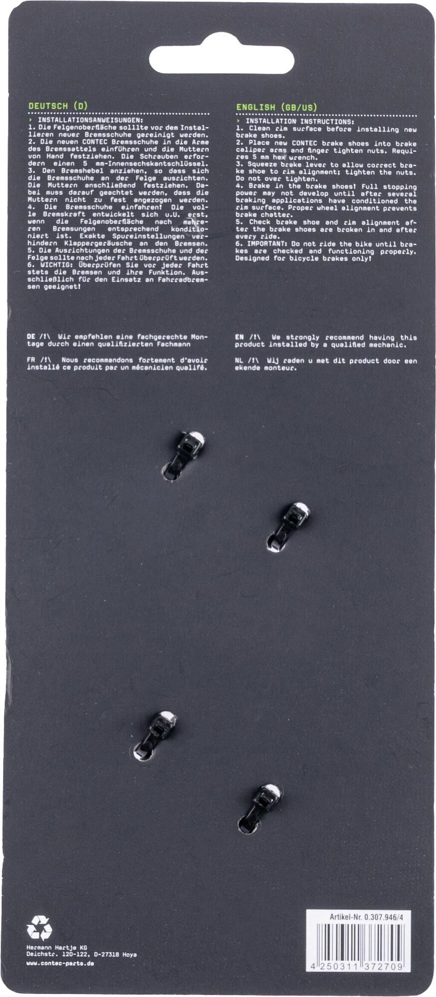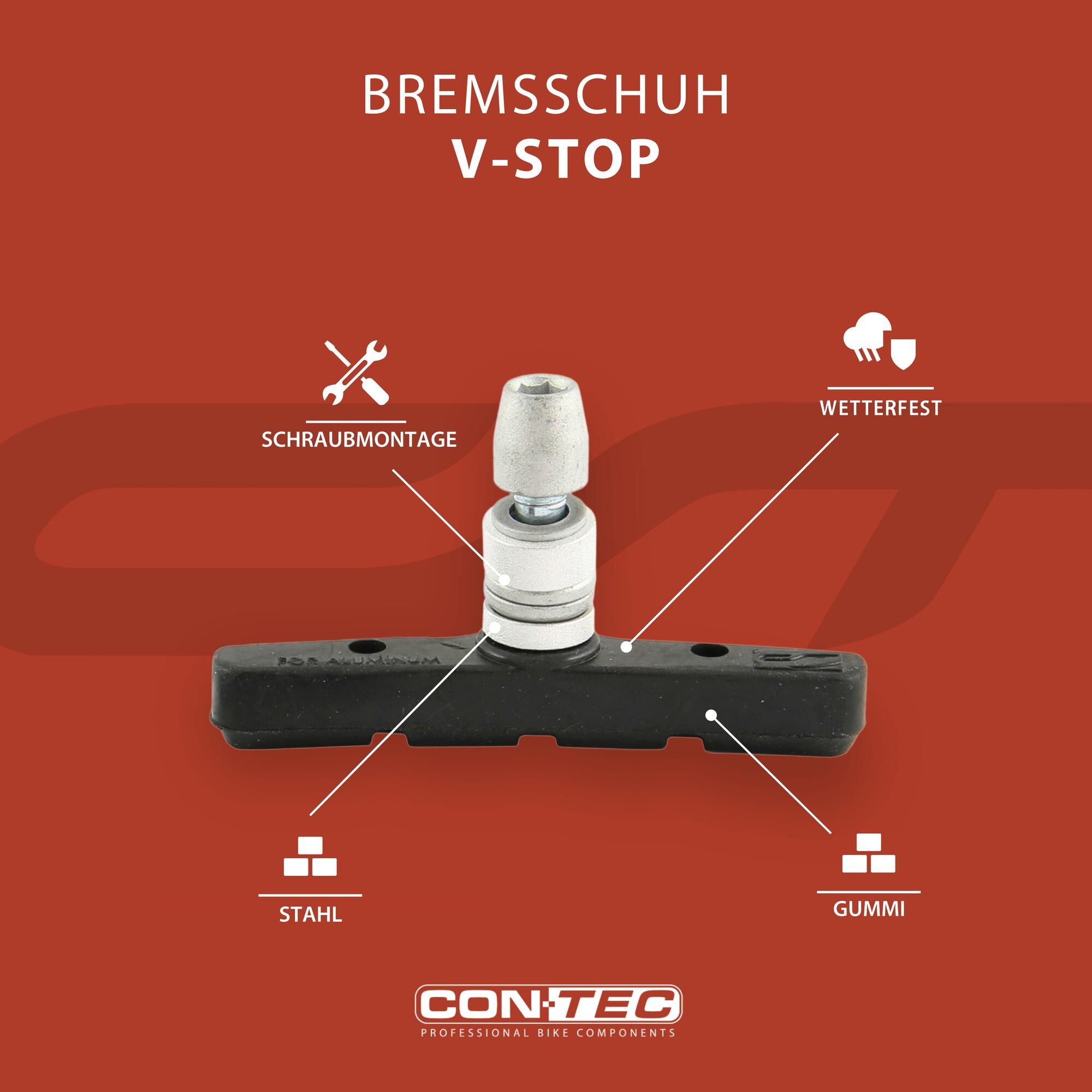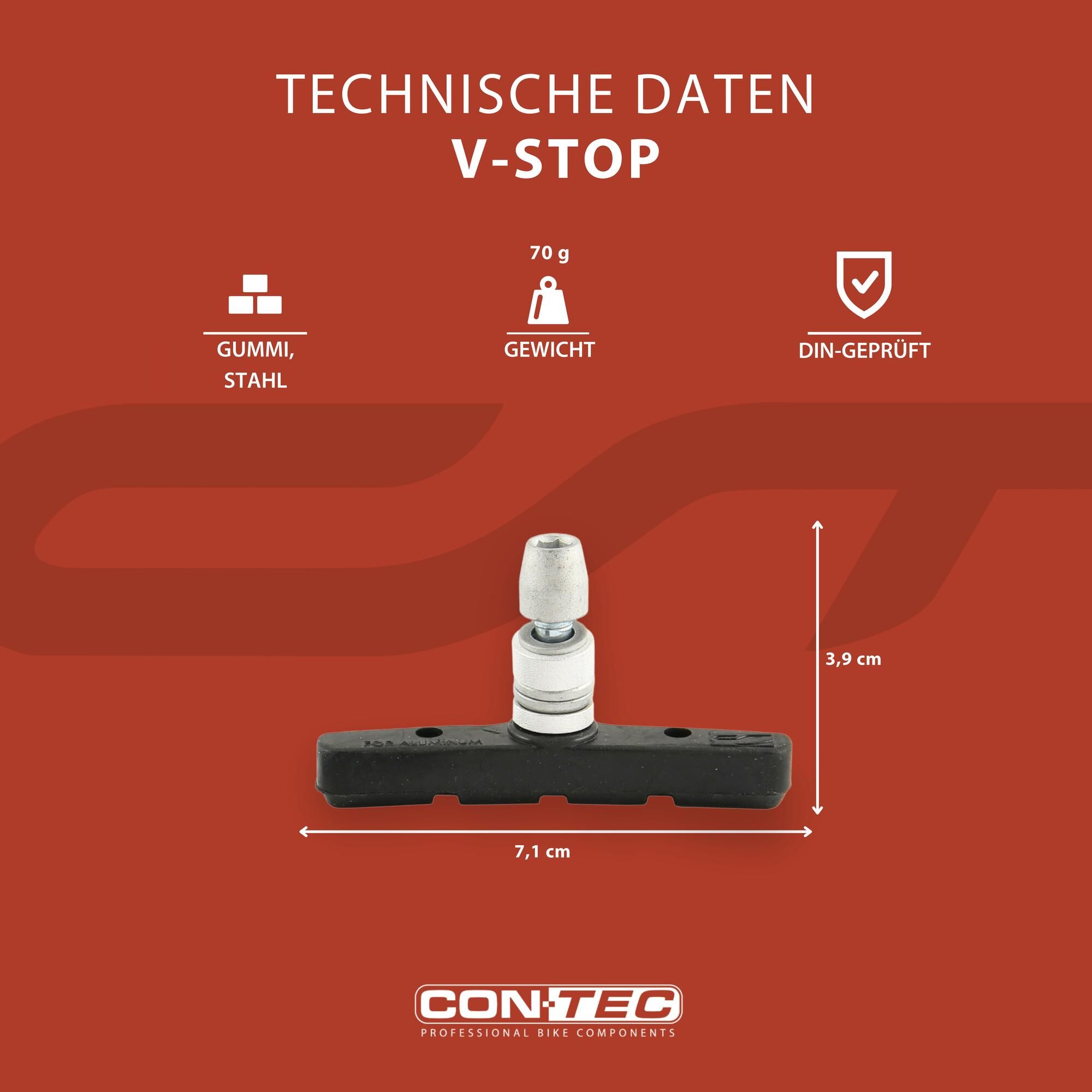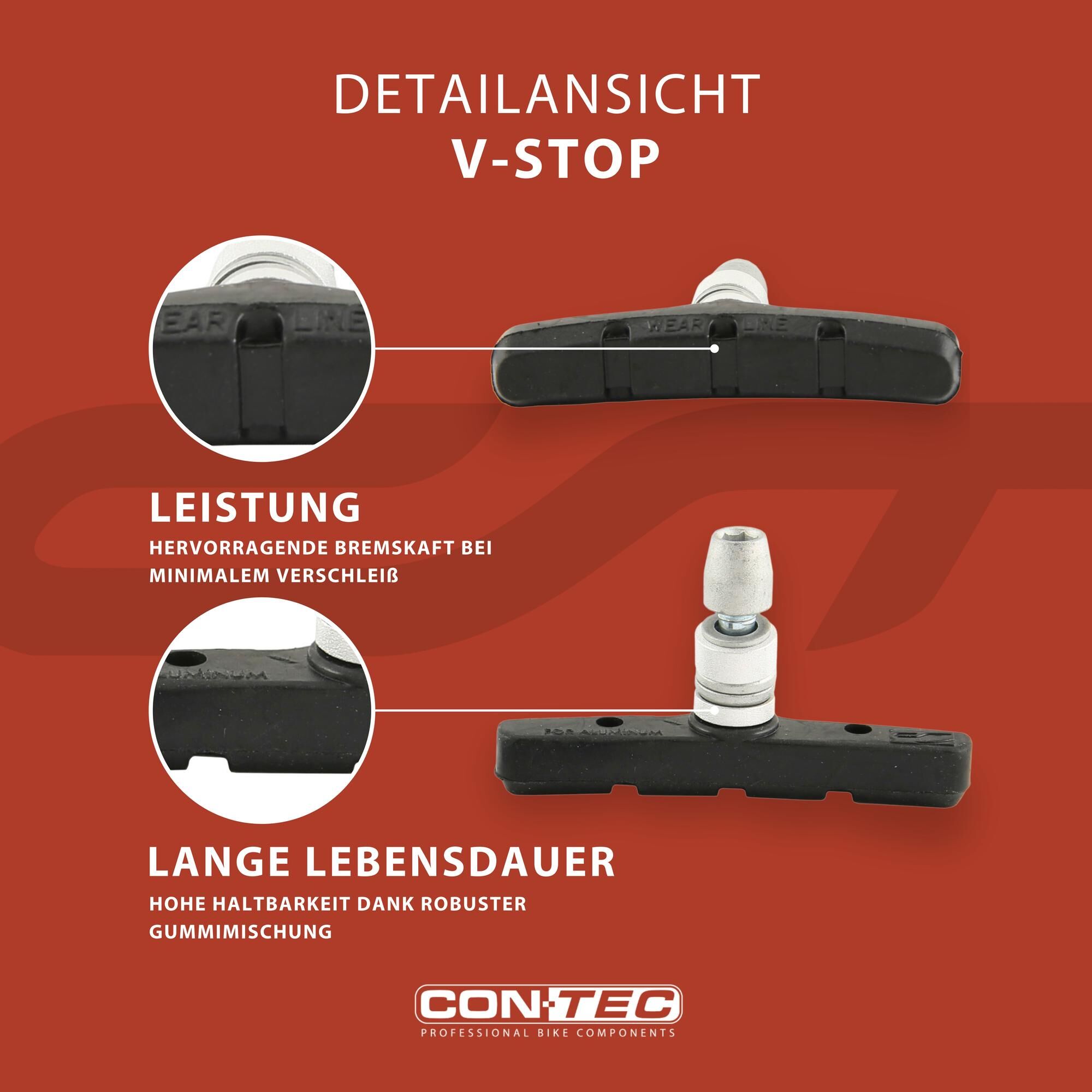 Optimum deceleration with minimum wear: This is what the brake pad "V-Stop" by CONTEC does. The reason for this is its Medium Compound. This brake pad is suitable for V-brakes (rim brakes). Although disc brakes are more common nowadays, rim brakes are popular with many. The advantages are the lower price and easier maintenance.The pad compound of the brake pad guarantees consistent braking both in dry and wet conditions. It takes care of safety. Finally, the braking force can be precisely modulated at all times."V-Stop" is DIN-tested, symmetrical and 70 mm wide. It can be assembled quickly and easily.A brake pad that ensures long-term and great deceleration.