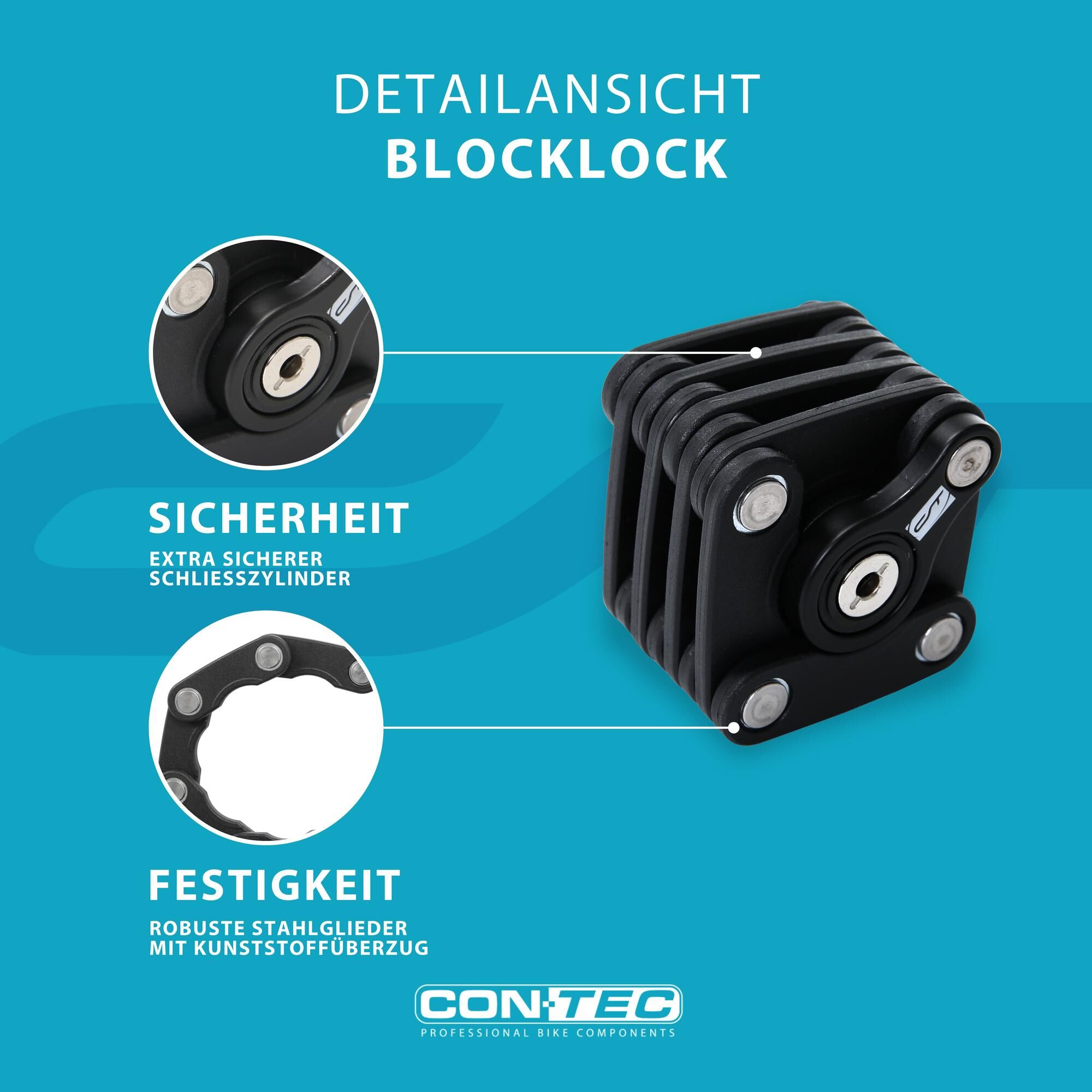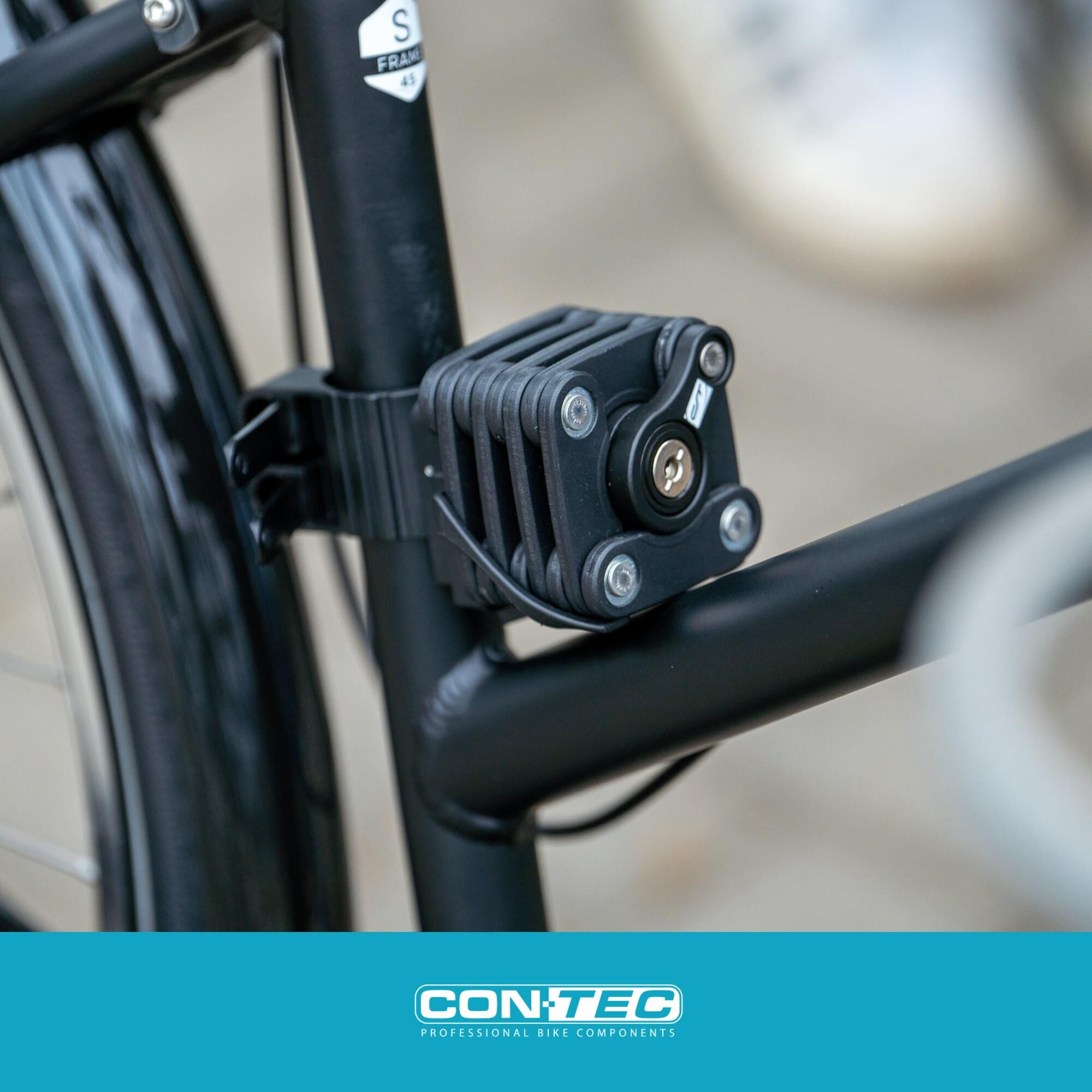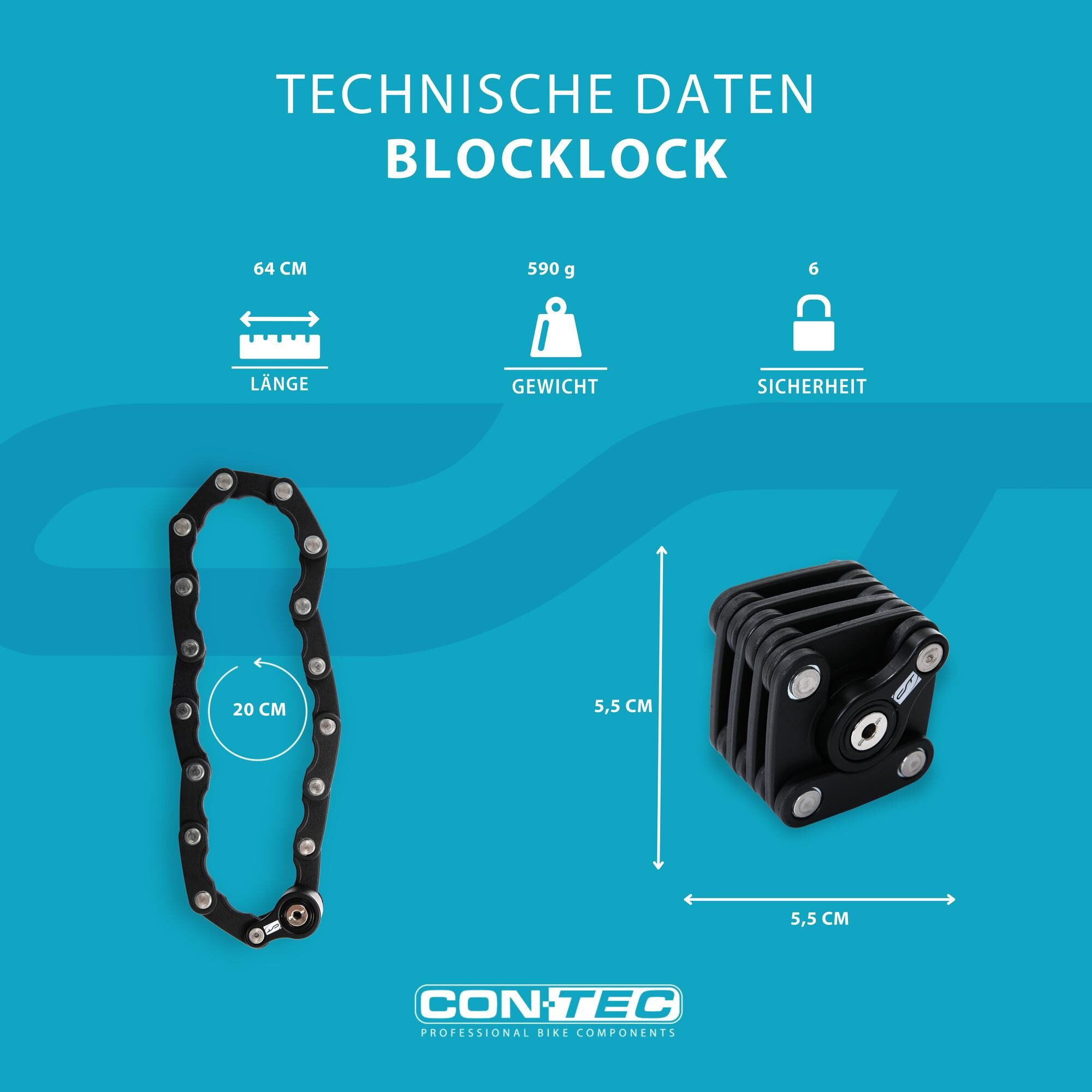 High quality lock for extra securityA bicycle lock must be one thing above all: Secure. With the CONTEC folding lock "Block Lock" the bicycle is securely locked up at any time and anywhere. In this way, it is reliably protected against theft at all times. The highly secure and handy folding lock is made of specially hardened steel. The extra-secure locking cylinder, together with this material, ensures optimum protection. Thanks to the steel links with a synthetic material cover, it is almost impossible to just snap through: Thieves don’t stand a chance.The quality bicycle lock by CONTEC has a mount and 2 keys. So there is always a replacement key available just in case. With a length of 640 mm, the folding lock is particularly versatile. If necessary, it can be folded down to the practical compact dimensions of 55 x 55 x 55 mm.The high-quality CONTEC bicycle lock equips cyclists in the city and on longer tours in the best possible way under all circumstances.