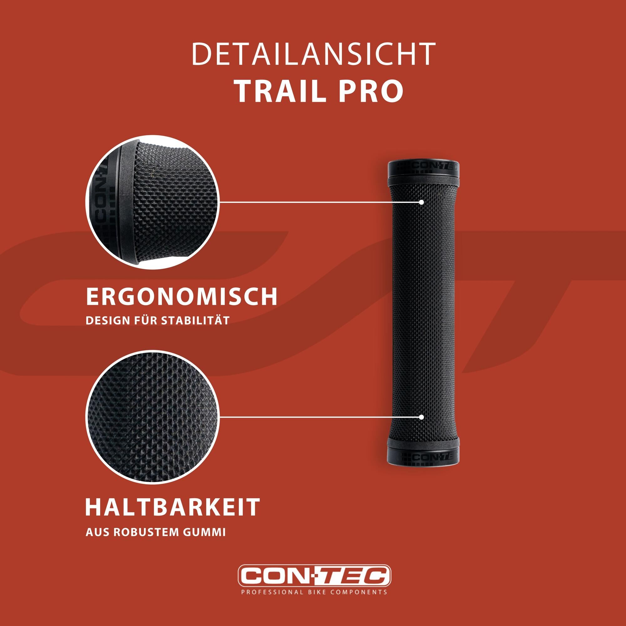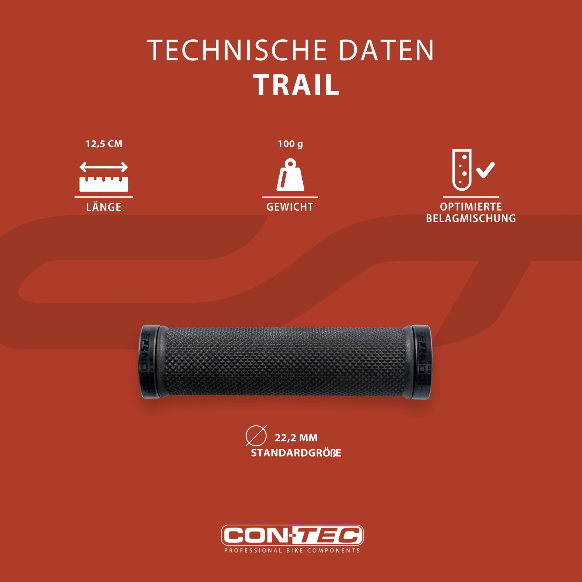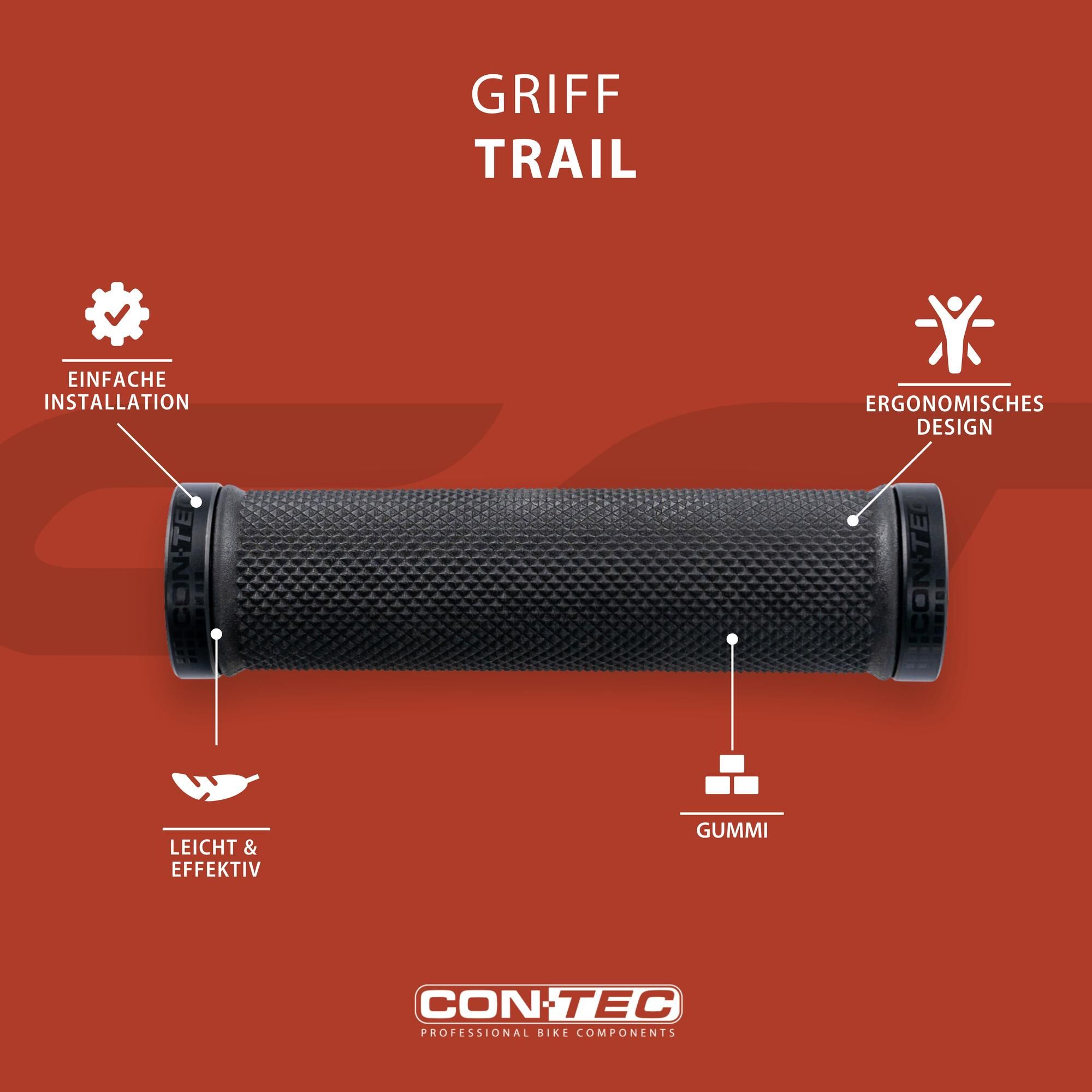 Precise manoeuvring and maximum control on bumpy routes require good grip on the handlebars and effective vibration damping. The CONTEC "Trail" grips convince professionals with well thought out ergonomic features.The special D2 two-component design with 2 rubber mixtures together with a grippy profile ensure optimal hold and good damping properties. A soft gel mixture in the palm area guarantees maximum comfort and shock absorption on uneven terrain, while a hard gel mixture in the outer grip area facilitate a good hold on the handlebar.The handlebar grip is compatible with the grip bar end plugs "G-Cap" and the grip clamp rings "G-Ring" by CONTEC, which make it particularly easy to install. It sets individual colour accents that match the look of the bike.The CONTEC "Trail” grip is 125 mm wide and available in pairs in black and white as well as as as in a Conway edition separately as a special item. Perfect for maximum off-road riding pleasure.