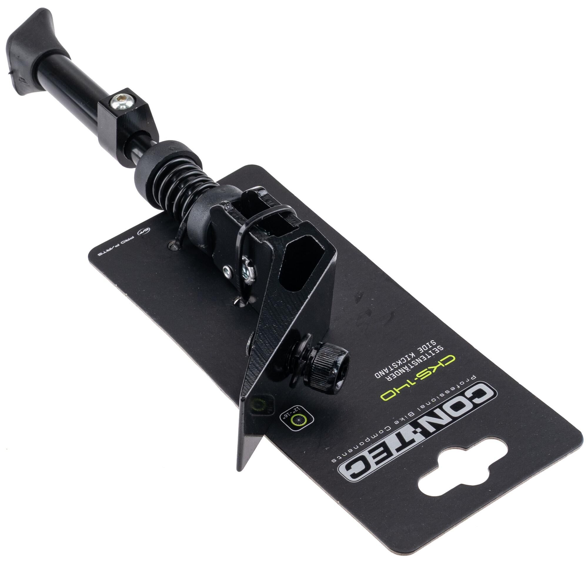 A helper for everyday lifeIn everyday life or in your leisure time, practical use is paramount. You want to have to worry about as little as possible. Everything should simply be taken care of. This is exactly where the "Babyfant" Kickstand from CONTEC comes in. On the one hand, as a popular attachment, it guarantees that the rider can park their bike comfortably anywhere and at any time. On the other hand, it impresses with its easy handling. It is adjustable for wheel sizes from 12 to 16" and can be easily mounted with an inside hexagon and spring washers.The stand is made of aluminum and has a plastic base. It is available in the paints silver and black and weighs 180 g. The bike stands stably on it.