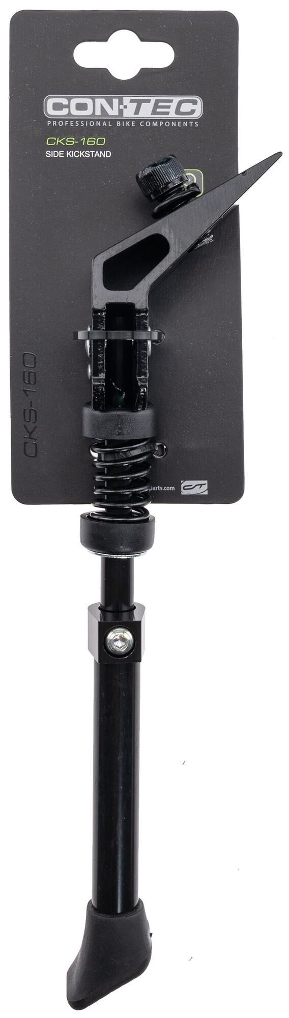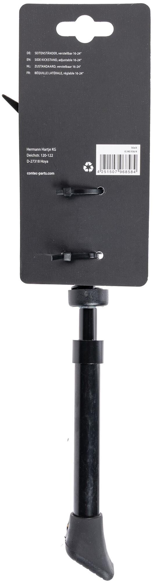 Kickstand from CONTECThe adjustable aluminum side stand Elefant by CONTEC is suitable for 16" to 24" wheels. It has a plastic base and is equipped with both a hexagon socket and a spring washer to secure the screw connection.