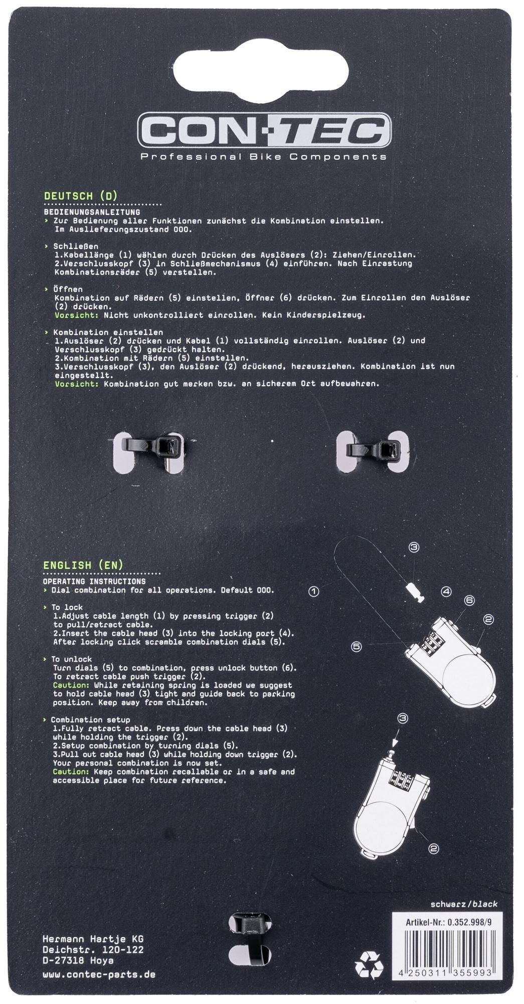 Allrounder to roll upThe CONTEC multi-function lock "Radio Lock" offers a wide range of other applications in addition to its use as a bike lock. A robust and stainless steel cable is at the core of this lock. Thanks to the braked retractor mechanism and the loop, it is versatile when it comes to securely locking up objects.The combination lock with a freely selectable code offers 1,000 options for a security combination. A functional and visually attractive companion for sports, leisure and travel.