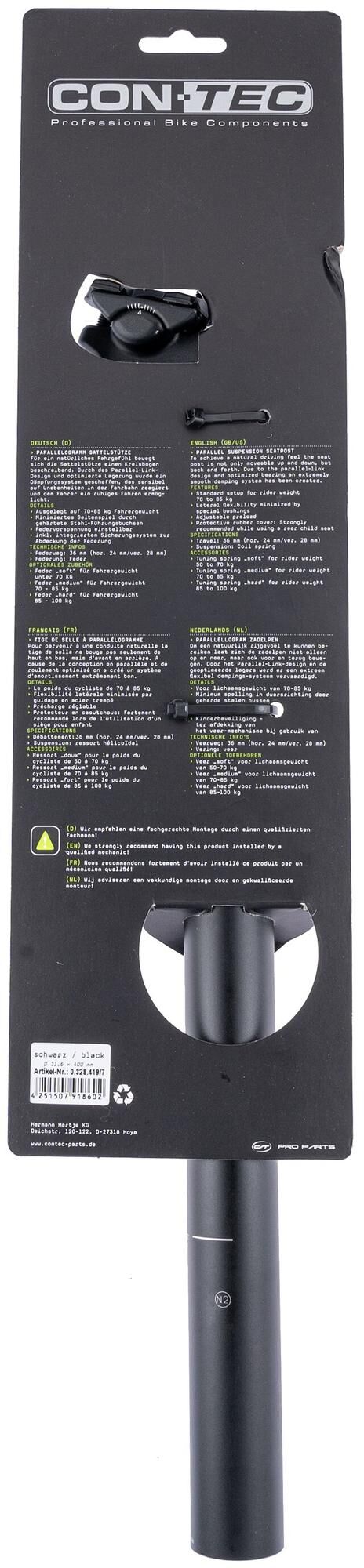 More comfort on rough terrainThe seatpost "SP-060 Slim Long Travel" by CONTEC offers more comfort for passionate cyclists. With its built-in, refined suspension, this carefully crafted model provides a high level of flexibility, especially on uneven roads and rough terrain. This makes the parallel suspension seatpost ideal for active tour riders and athletic bikers.This slim parallelogram suspension seatpost is made of aluminium and has an extended travel of 36 mm. It is optimal for a rider weighing between 70 to 85 kg. With the help of replacement springs, the seatpost also provides optimum suspension for riders weighing 50 to 70 kg, 85 to 100 kg and 100 to 130 kg.The "SP-060 Slim Long Travel" by CONTEC can be easily combined with different coloured saddles and frames.