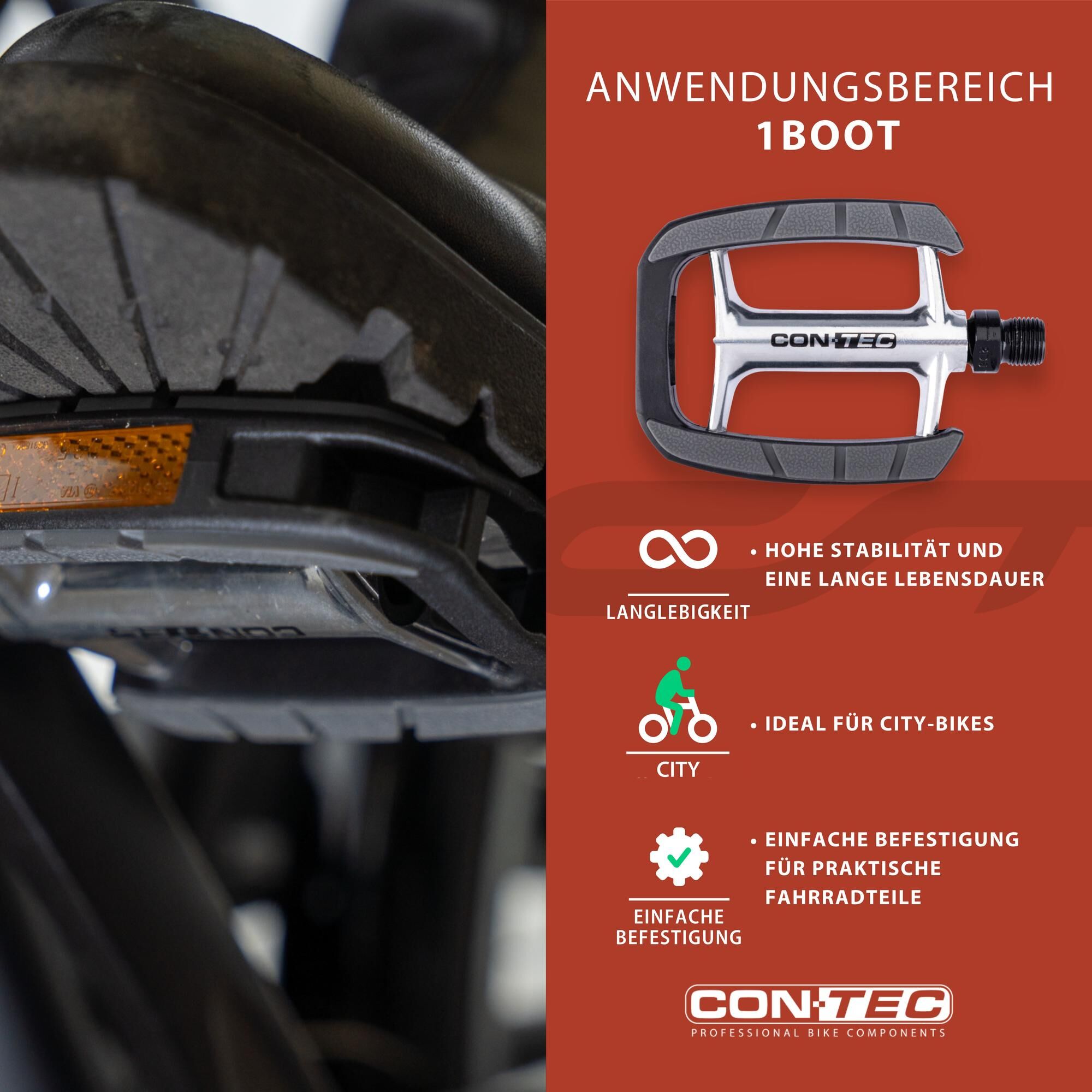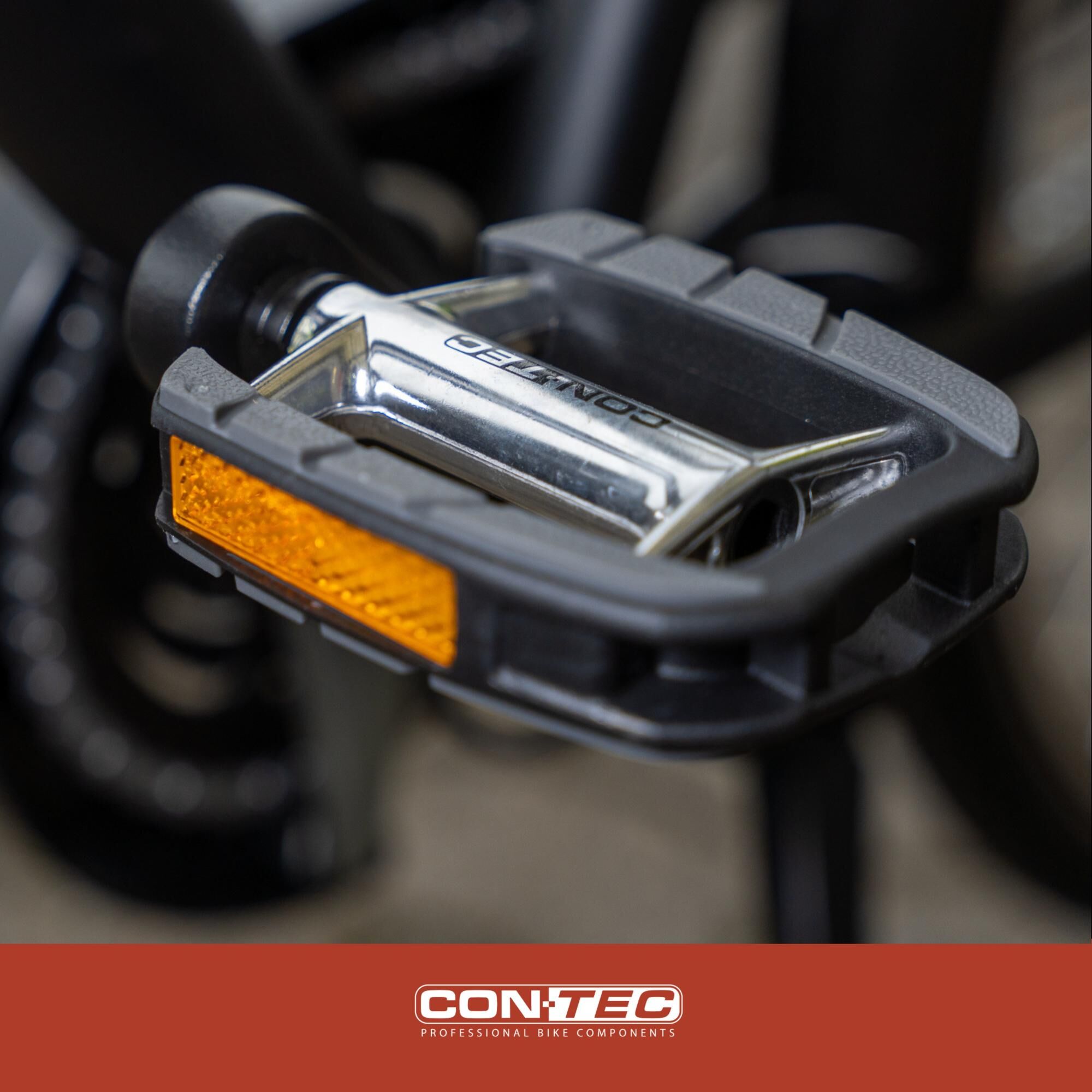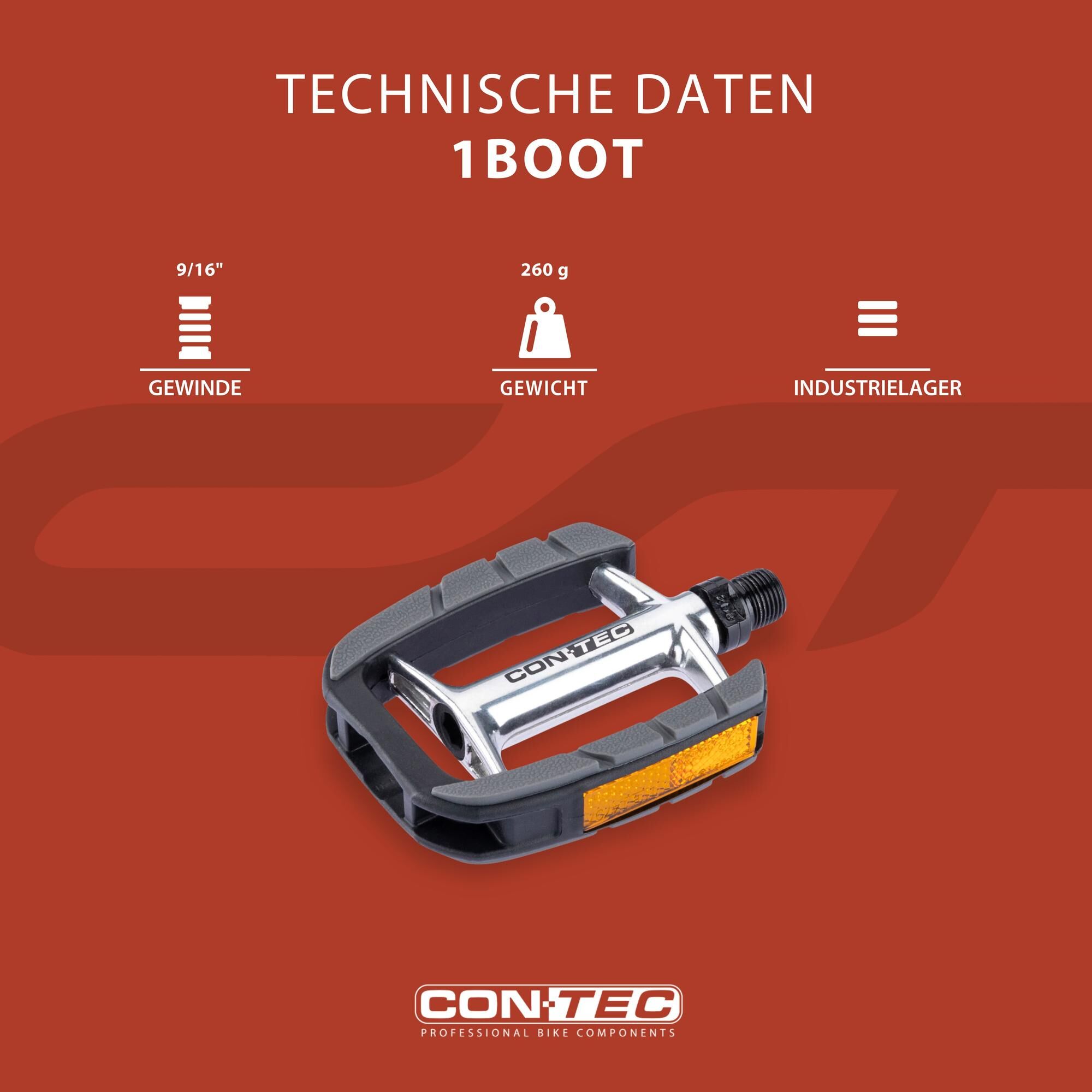 Non-slip & reflectiveThe CONTEC touring/trekking pedal "1Boot" has everything needed for unforgettable tours. A pedal made of stable aluminium!With the "1Boot", the passionate cyclist gets a high-quality trekking pedal under their feet. The robust plastic cage features an extremely non-slip contact area, whose grip profile promises first-class hold even in wet weather and muddy conditions. The integrated and clearly visible reflectors also contribute to safety on this sporty pedal.The durability of this trekking pedal is realised by means of the sealed cartridge bearing and the aluminium body. In addition, the shimmering CrMo axle not only provides a shiny look, but also provides impressive stability. Both significantly increase riding pleasure.This 9/16" pedal is a lightweight with only about 260 g, which combines its excellent pedalling characteristics with the proven robustness of aluminium. An ideal companion for those who value safety all the way down to the pedal!