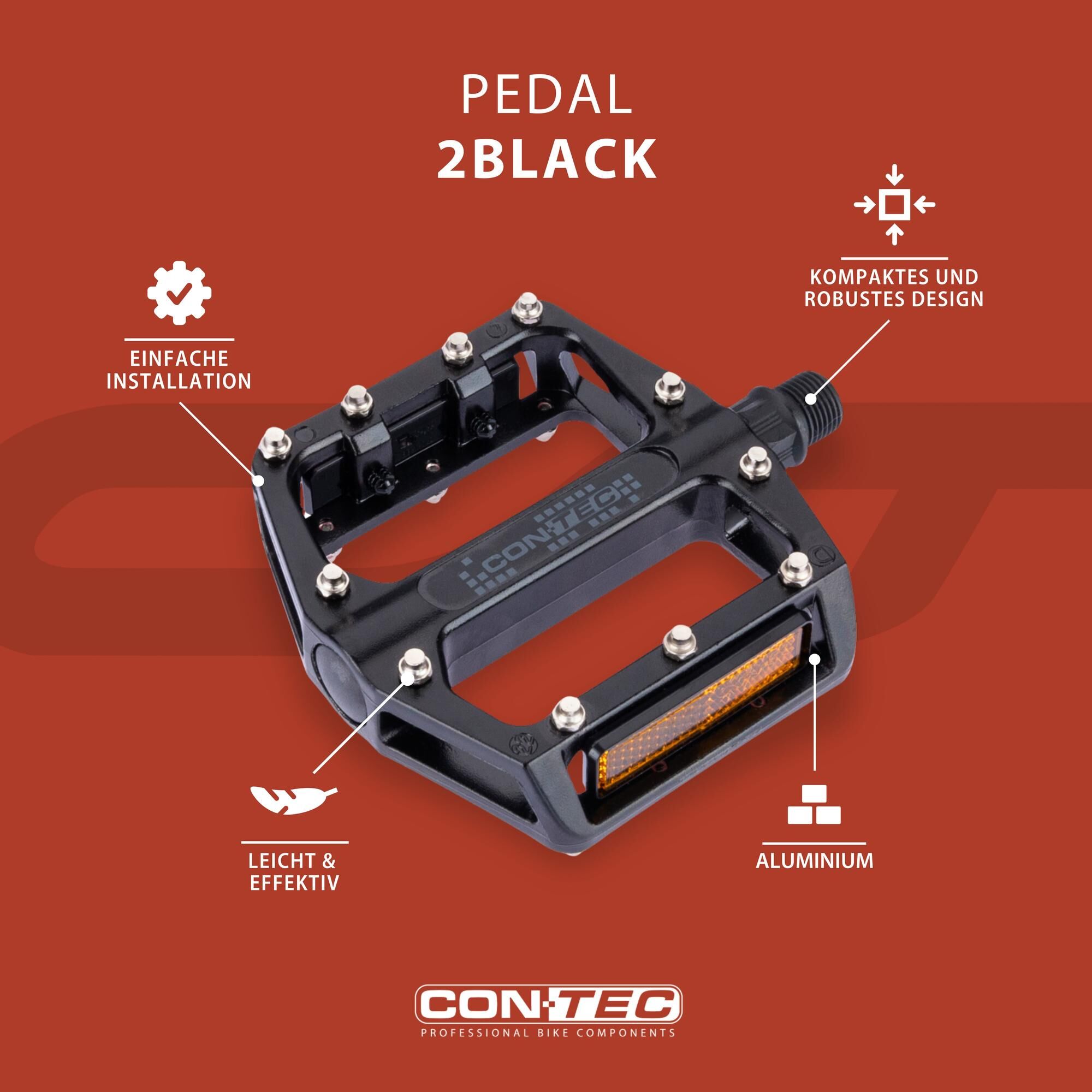 Unbeatable in the terrainEspecially for steep and longer climbs with an MTB on the trail, in the bike park or for longer rides in rough terrain, a larger contact area on the pedal ensures improved ergonomics, more safety and more efficient power transmission. The CONTEC platform pedal "2Black" is perfectly adapted to these requirements: The one-piece aluminium body offers a generous contact area and torsional stiffness under high loads with a total weight of both pedals of only 420 g.The robust axle made of high-quality CrMo steel with a typical 9/16" thread also contributes to the durability and stability of the pedal. This steel alloy is characterised by robustness and break resistance, which is an added benefit in terms of safety and reliability due to the high continuous loads in mountain bike sports. Smooth-running ball bearings ensure supple rotation and great forward motion.The CONTEC platform pedal "2Black" can also be adapted to personal needs on and off the trail by means of removable reflectors and replaceable pins (R-pins) and can be used in the long term without having to compromise. Lost or worn pins can easily be replaced with new single or different coloured R pins, which are screwed into the intended threads with the supplied spanner.The platform pedal "2Black" meets the high demands and requirements of enthusiastic mountain bikers by using high-quality and robust materials and sensible features. It is an ideal upgrade for any MTB.