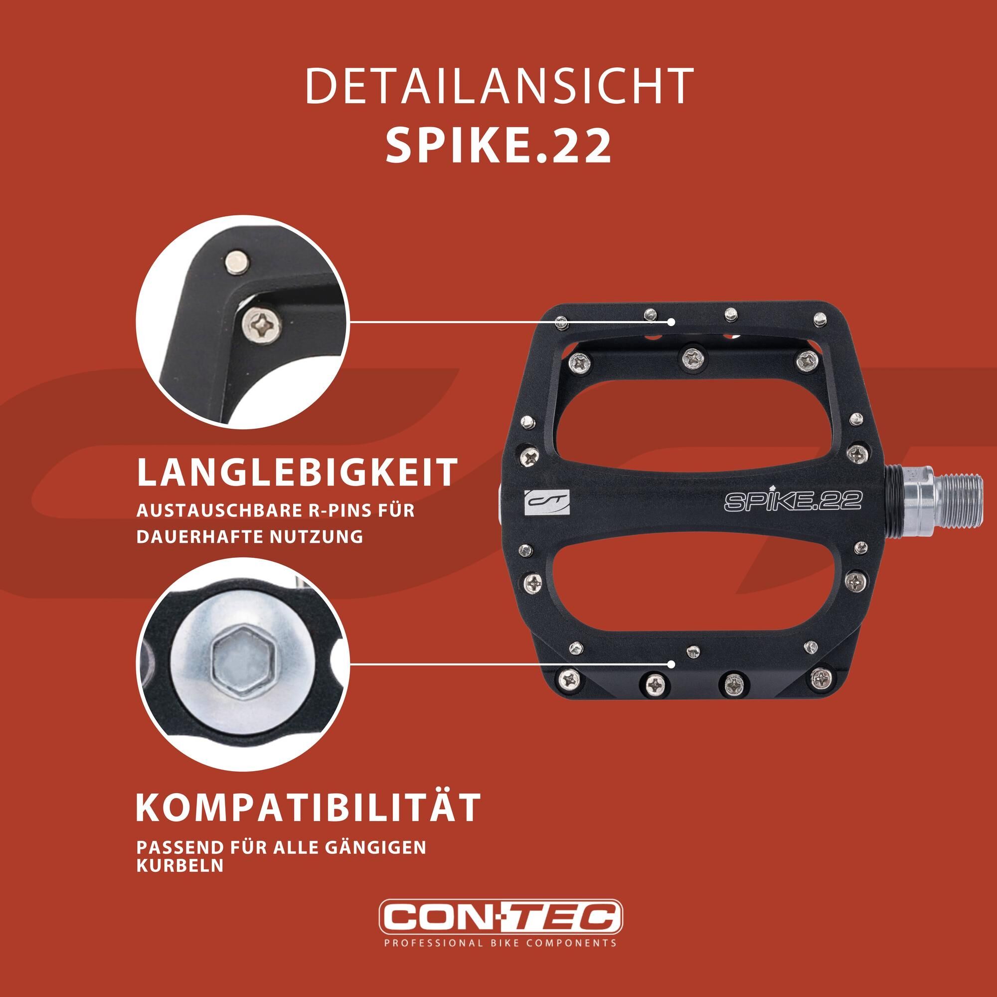 Reliability & quality for highest demandsHigh jumps, deep drops, through water and mud as well as long, steep slopes - those who are enthusiastic about technically demanding freeriding know about the extremely high loads to which the pedals are constantly exposed. The CONTEC MTB/freeride pedal "Spike.22" is the perfect choice for those who do not want to compromise on quality, ergonomics or reliability.The "Spike.22" consists of a robust, extremely torsionally-resistant and lightweight aluminium cage and aluminium body. Thanks to the CNC-milled axle with the typical 9/16" thread made of particularly break-proof CrMo steel, the "Spike.22" can handle even the heaviest hits off-road and can be mounted on any common crank.The 2 x 22 replaceable CrMo pins on the large contact surfaces ensure maximum grip even in muddy and wet conditions. They can be replaced as need: Lost or worn pins can easily be replaced by CONTEC R-pins by screwing them into the threaded inserts provided with the appropriate tool.Sealed cartridge bearings ensure maximum smooth rotation and long durability and effectively prevent premature wear due to the ingress of moisture and dirt. Without reflectors, made of aluminium and in solid quality, the CONTEC MTB/freeride pedal "Spike.22" is reduced to the essentials and is specifically adapted to the off-road requirements on an MTB.Due to its durability and extremely robust manufacturing as well as the retrofit capability of lost or worn R-pins, this pedal is the first choice for freeriders who value the highest quality in their components.