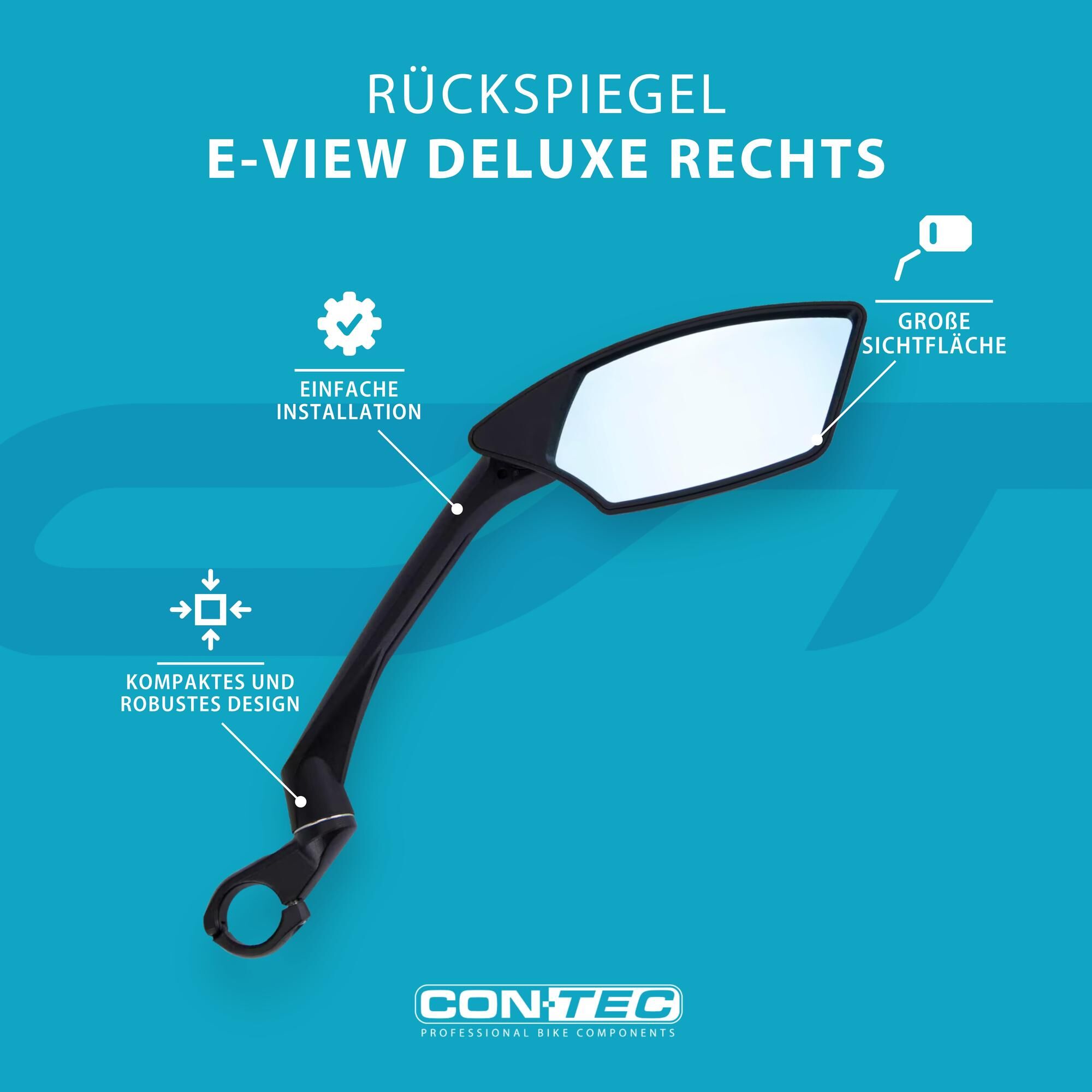 Modern technology and futuristic shape - that's the CONTEC rear-view mirror "E-View Deluxe". It meets high demands on functionality and design. Individually adjustable thanks to the well thought out joint function, the rear-view mirror offers the best view for a cyclist. The wide-angle mirror has a dimming function. It prevents vehicles with high-beam headlights from blinding from the rear. In addition, reflectors at the back provide additional protection. The nylon frame with fibreglass is very robust and also suitable for rides on bumpy terrain.When riding a bicycle, consideration for your own safety and the safety of other road users is important. Even in a group, a bicycle mirror makes the ride more comfortable. "E-View Deluxe" is a helpful companion on all rides. It is easily mounted on a bicycle handlebar with a diameter of 22.2 mm and is then ready to use immediately. In classic black, with a soft blue tint and an unmistakable angular shape: The "E-View Deluxe" rear-view mirror by CONTEC is a safety element on the bicycle and at the same time an attractive eye-catcher.