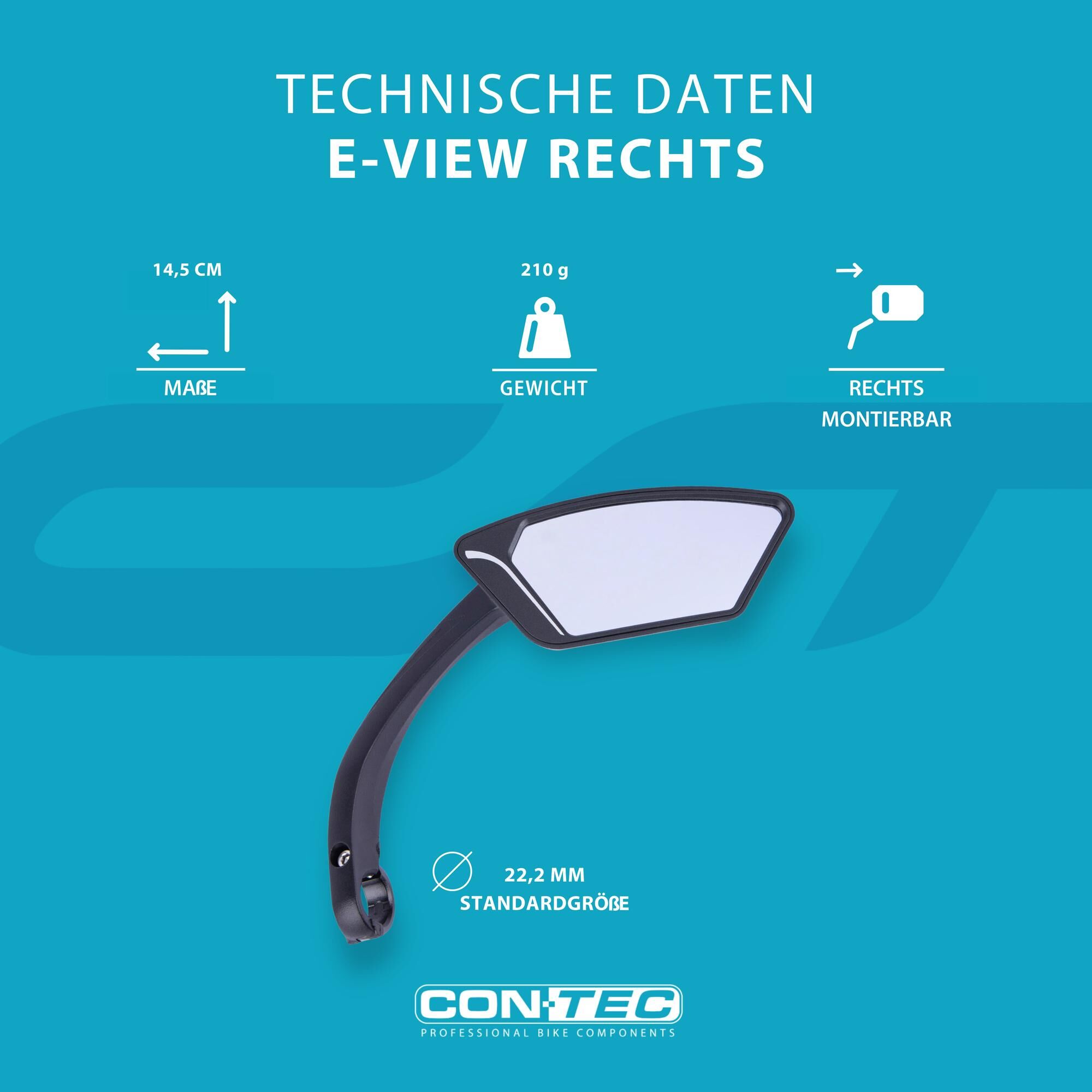 Una rapida visione d'insiemeLo Specchietto retrovisore "E-View" offre un'eccellente panoramica sulla e-bike o sulla bicicletta. La particolarità è la testa dello specchio regolabile a 360° con lente in acciaio inox. In questo modo si ha un'ottima visione di tutto ciò che ci circonda. Lo Specchietto è dotato di una lente antiabbagliamento che riduce i riflessi fino al 50%. Questo specchietto retrovisore, ideale per le e-bike, ha una robusta cornice in nylon con fibra di vetro. È adatto a manubri con un diametro di 22,2 mm.L'"E-View" di CONTEC è disponibile per il montaggio sul lato destro o sinistro.