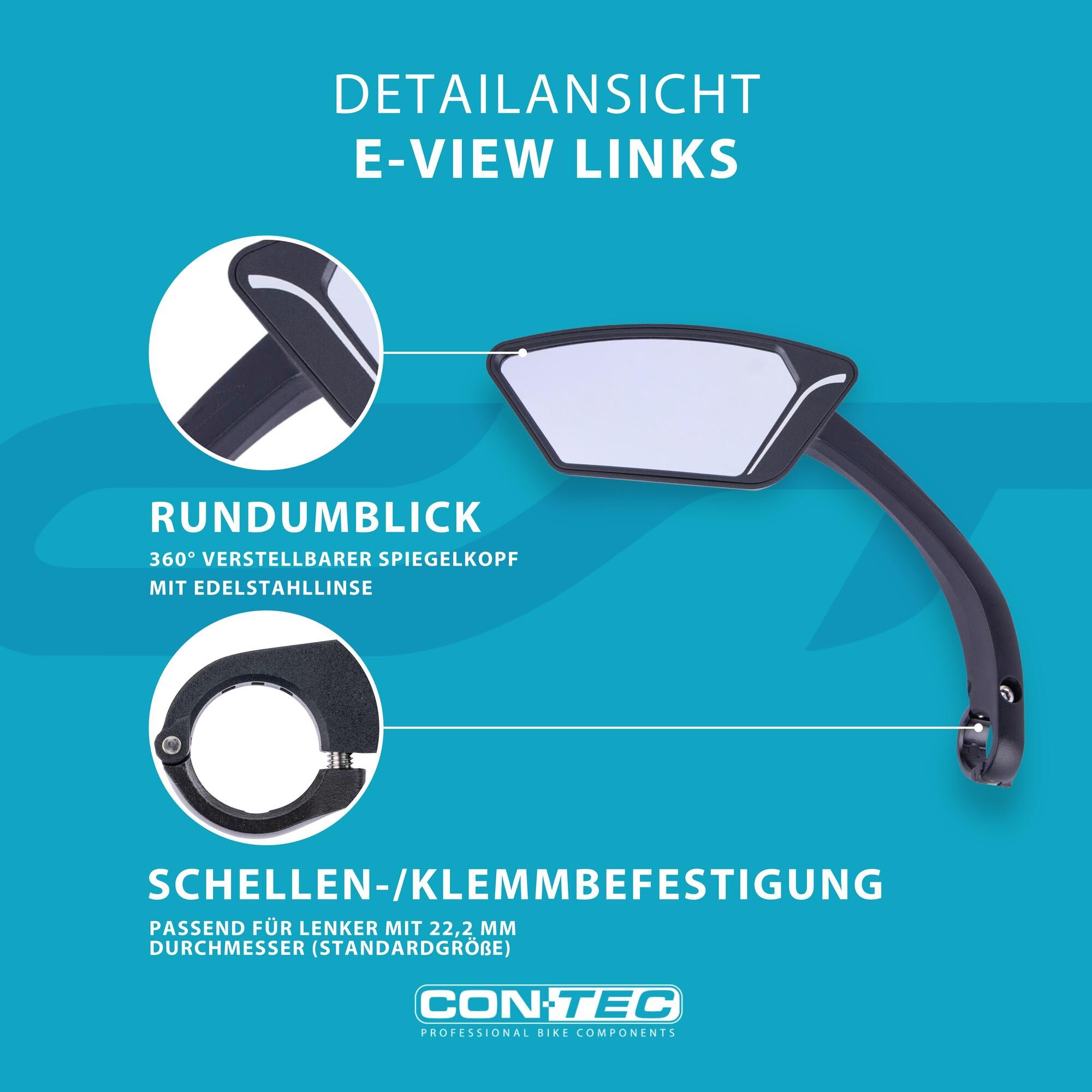 Una rapida visione d'insiemeLo Specchietto retrovisore "E-View" offre un'eccellente panoramica sulla e-bike o sulla bicicletta. La particolarità è la testa dello specchio regolabile a 360° con lente in acciaio inox. In questo modo si ha un'ottima visione di tutto ciò che ci circonda. Lo Specchietto è dotato di una lente antiabbagliamento che riduce i riflessi fino al 50%. Questo specchietto retrovisore, ideale per le e-bike, ha una robusta cornice in nylon con fibra di vetro. È adatto a manubri con un diametro di 22,2 mm.L'"E-View" di CONTEC è disponibile per il montaggio sul lato destro o sinistro.