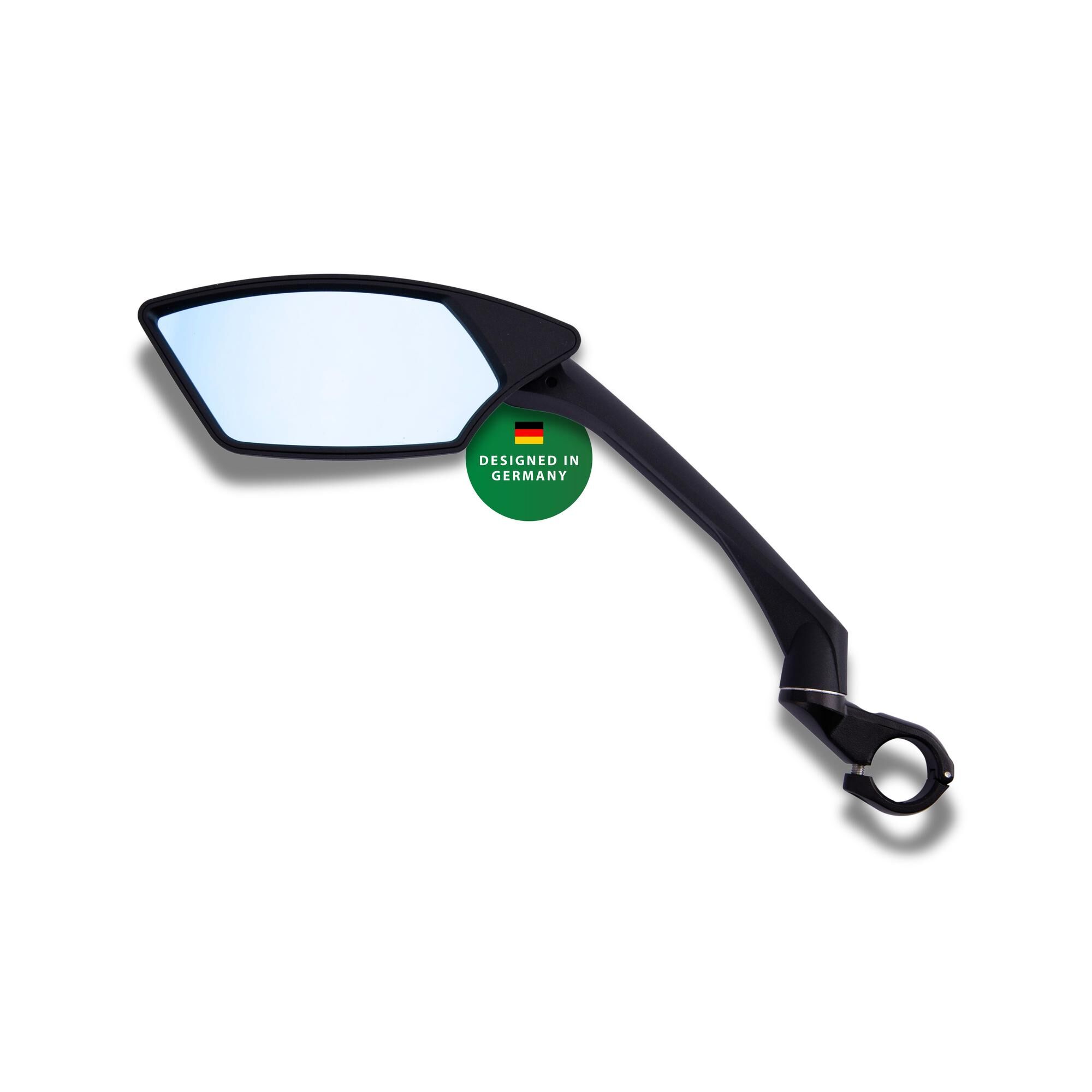 Met Dazz lens (tot max. 75 % minder reflectie),compatibel met E-bike displays (bijv. Bosch Intuvia) vanwege het scharnier op de klem en de verschuiving naar achteren, verstelbare groothoekspiegel met dimmende functie om verblinding in het donker te voorkomen, frame van nylon met aandeel glasvezels